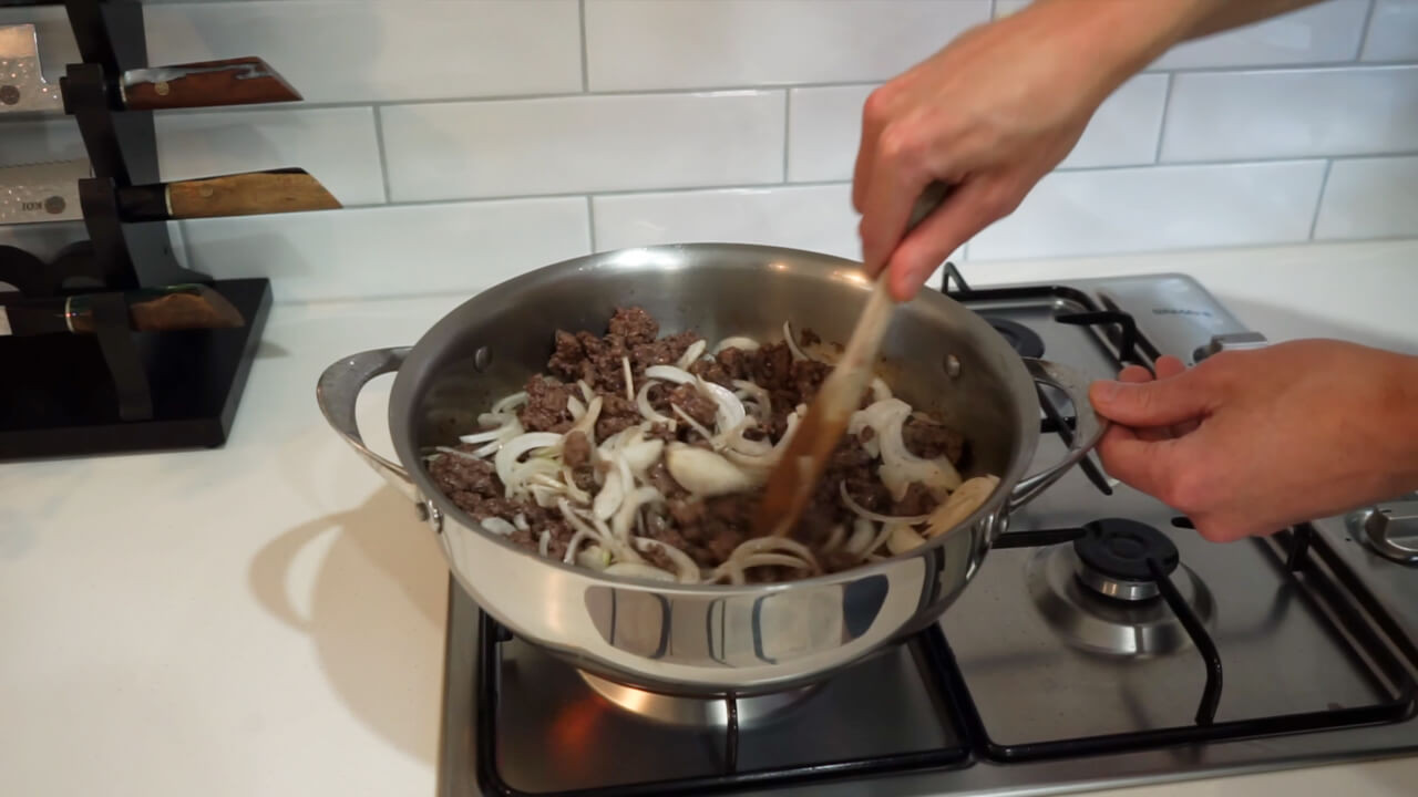 After cooking the ground beef for 3 minutes, add the onions that were previously chopped and mix everything together.