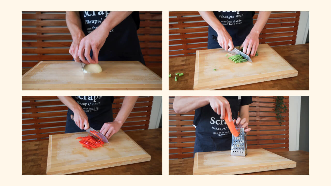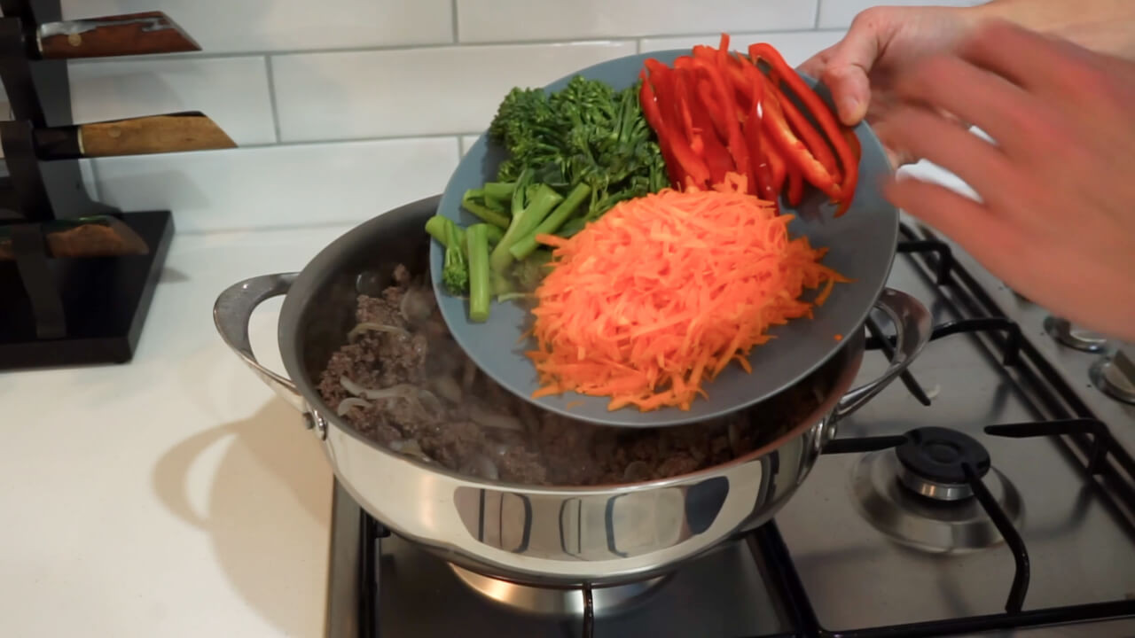 Cut one brown (or yellow) onion into thin slices or stripes, thinly slice one red bell pepper (also known as capsicum), grate one washed carrot, and chop a bunch of 300g broccolini into small pieces.