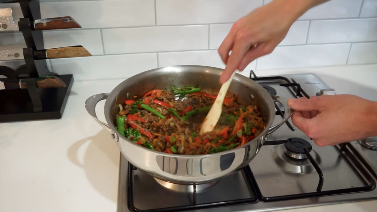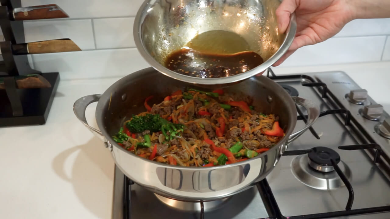 After cooking the beef and vegetables, mix them together with the sauce.