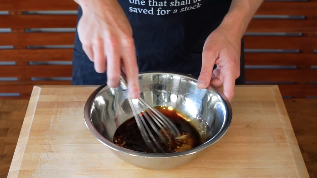 In a bowl, mix together 100g of low-sodium soy sauce, 40ml of rice vinegar, 70g of brown sugar, and 15ml of toasted sesame oil. Finally, add 5 cloves of minced garlic and 15g of minced ginger to the mixture.