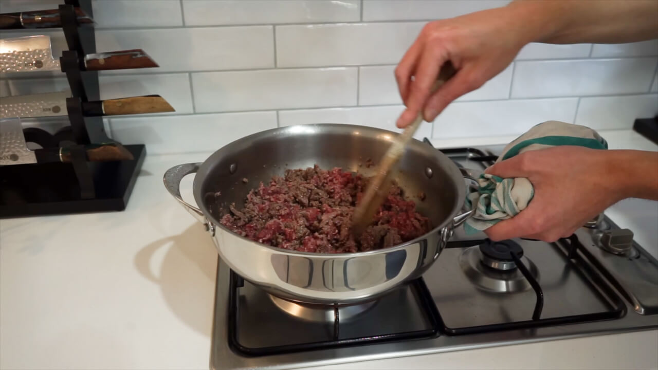 Preheat a pan with 30ml of peanut oil, then add ground beef and cook it for 3 minutes.