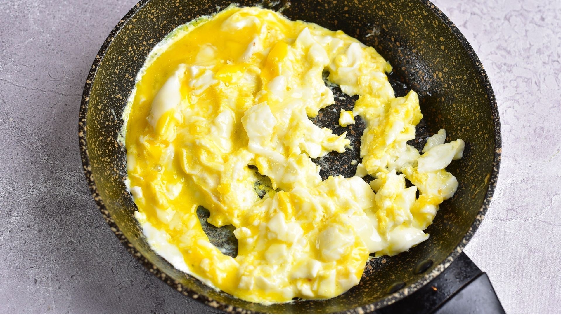 Heat oil for frying in a frying pan. Beat the eggs into a pan and fry over low heat, stirring occasionally with a spatula. Salt and cook the scramble for 5 minutes.