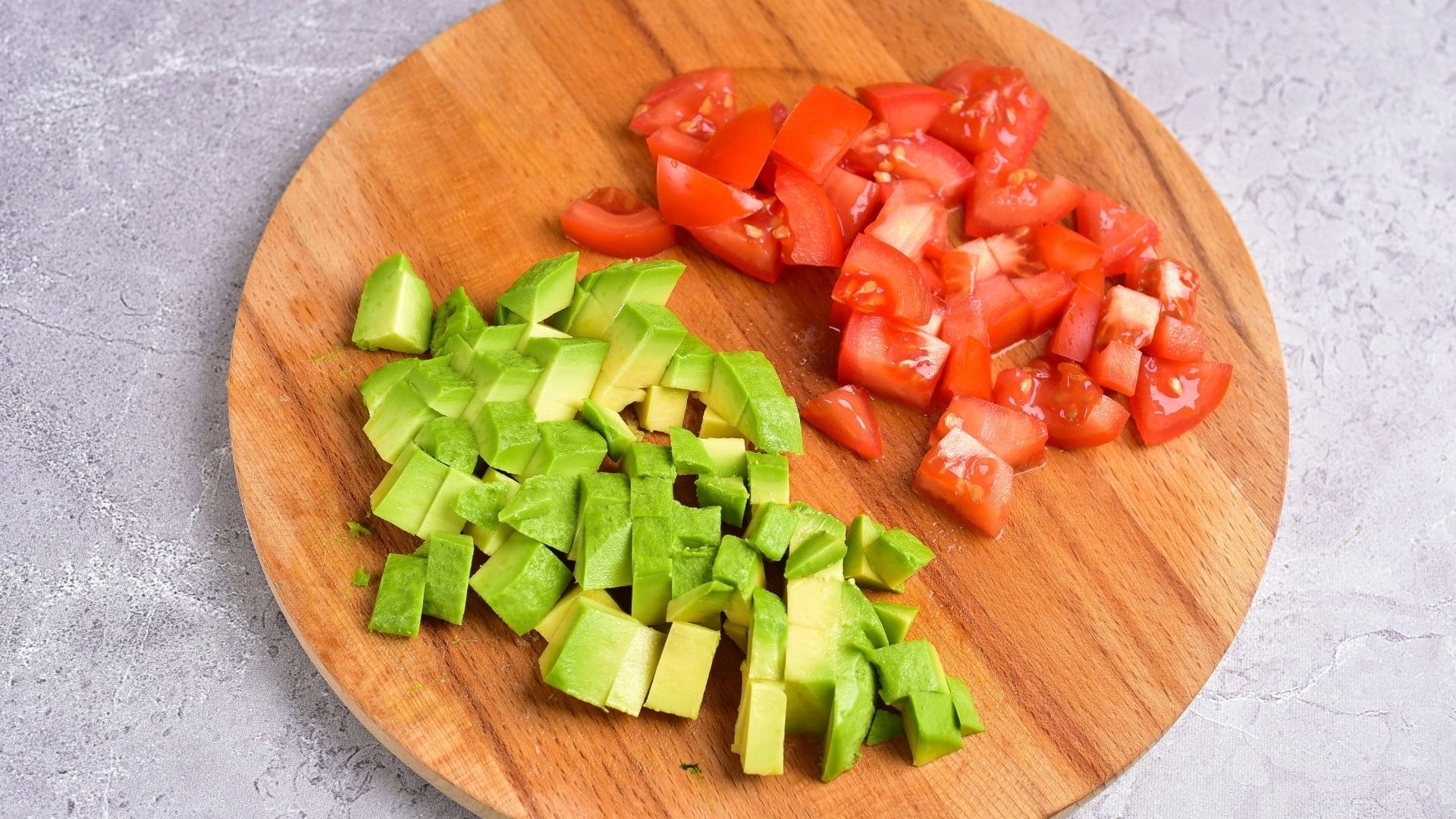 Peel the avocado and remove the pit, cut into cubes. Wash the tomato and also cut into cubes.