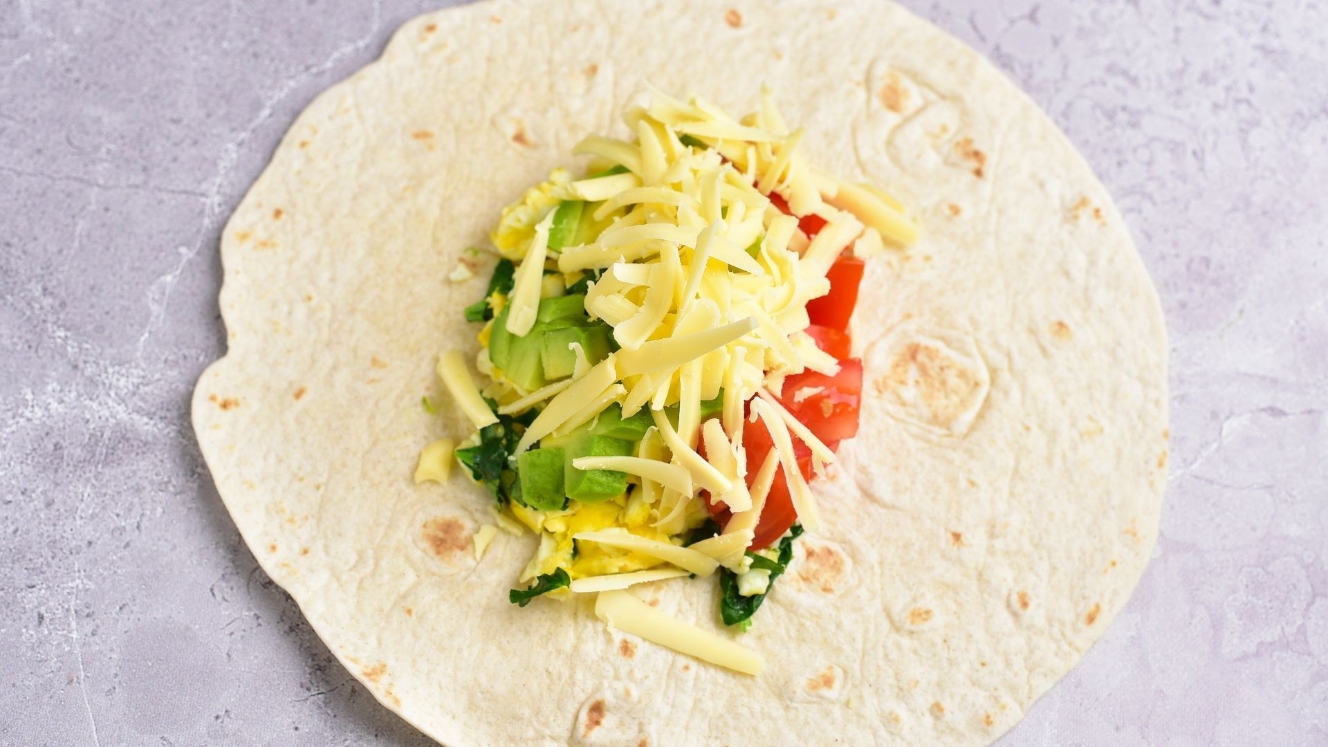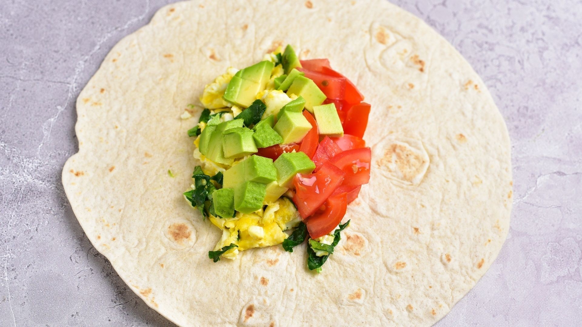 A Breakfast Burrito filled with scramble, spinach, avocado, tomato and cheddar is a great way to start your day energetically. You can eat this burrito at home or take it with you when traveling or to work. Use a tortilla made from wheat, corn, or whole grain flour.