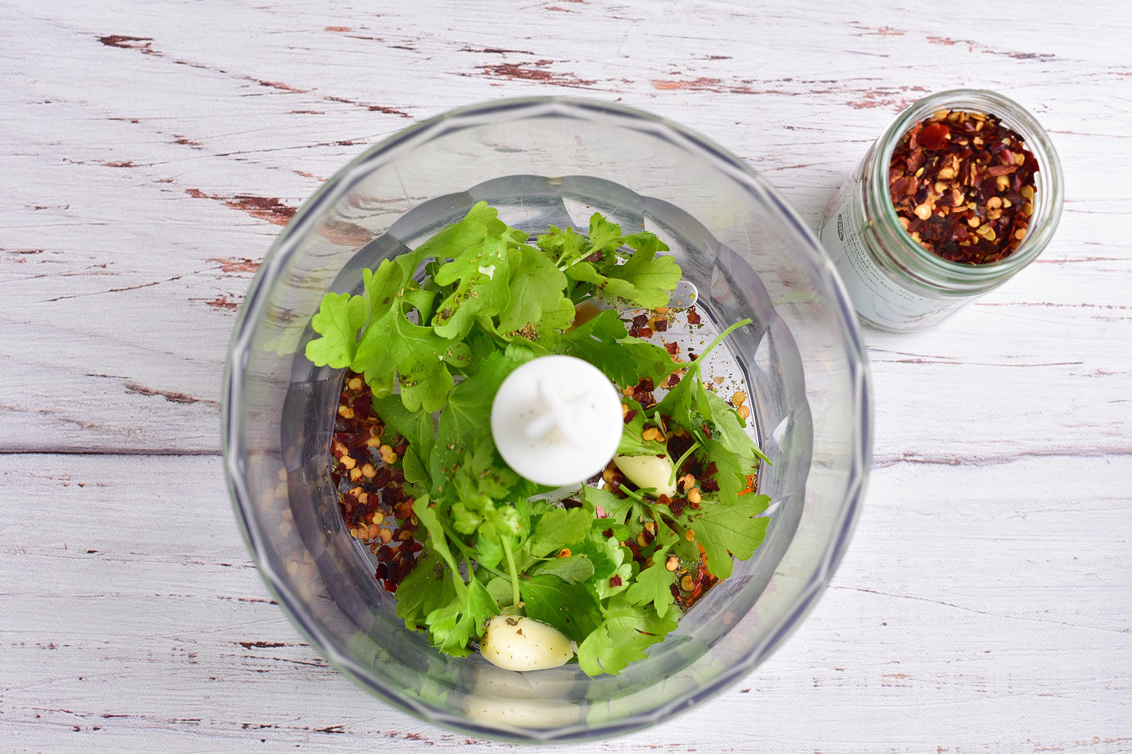 Put fresh herbs (parsley, cilantro), peeled garlic, red pepper flakes, red wine vinegar in a blender bowl.