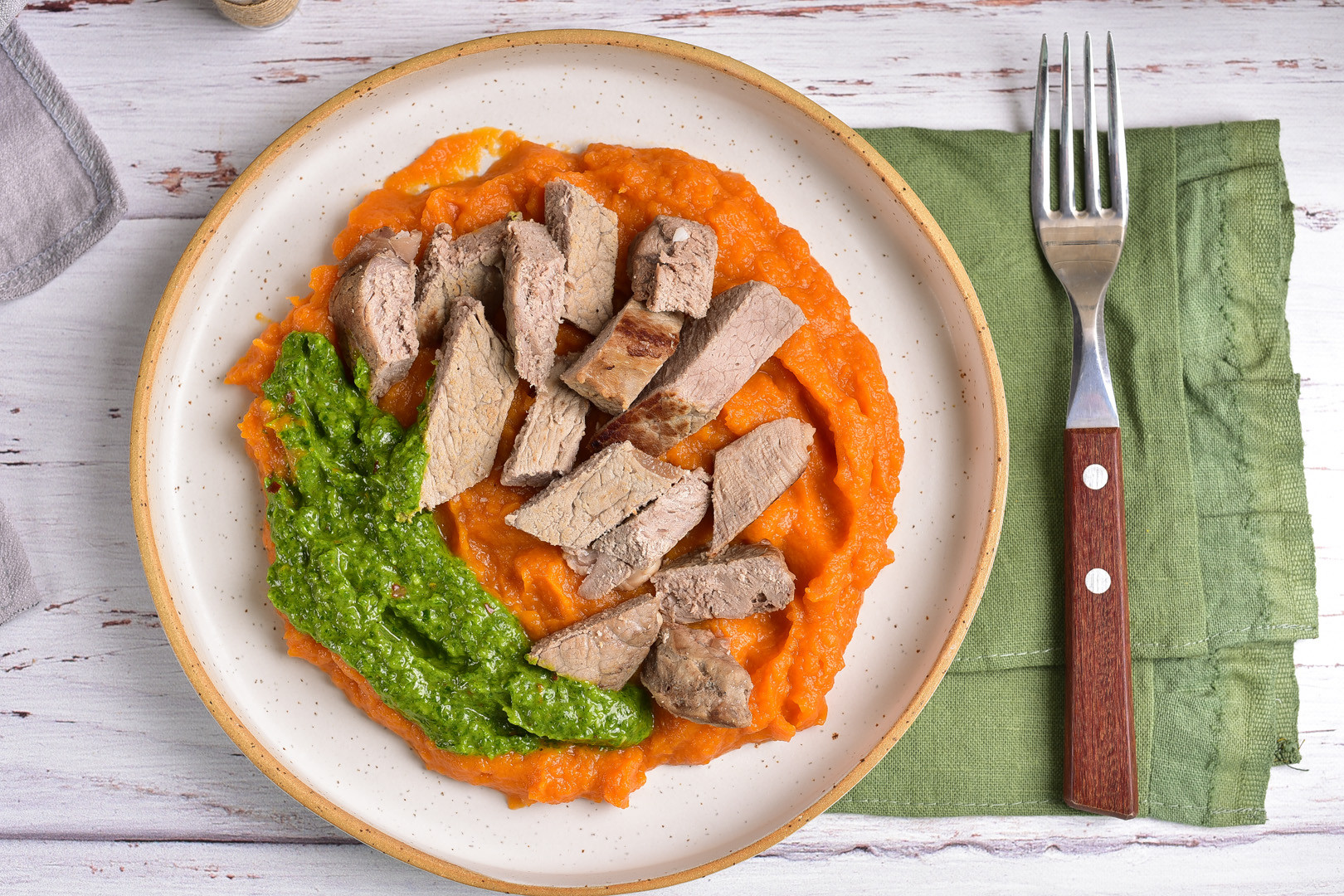 Chimichurri Steak is pieces of soft juicy beef combined with tender sweet potato puree and aromatic sauce with cilantro, parsley, garlic, and red pepper flakes. The sauce is a little spicy, however, if you add more garlic and pepper flakes, it will be hot.