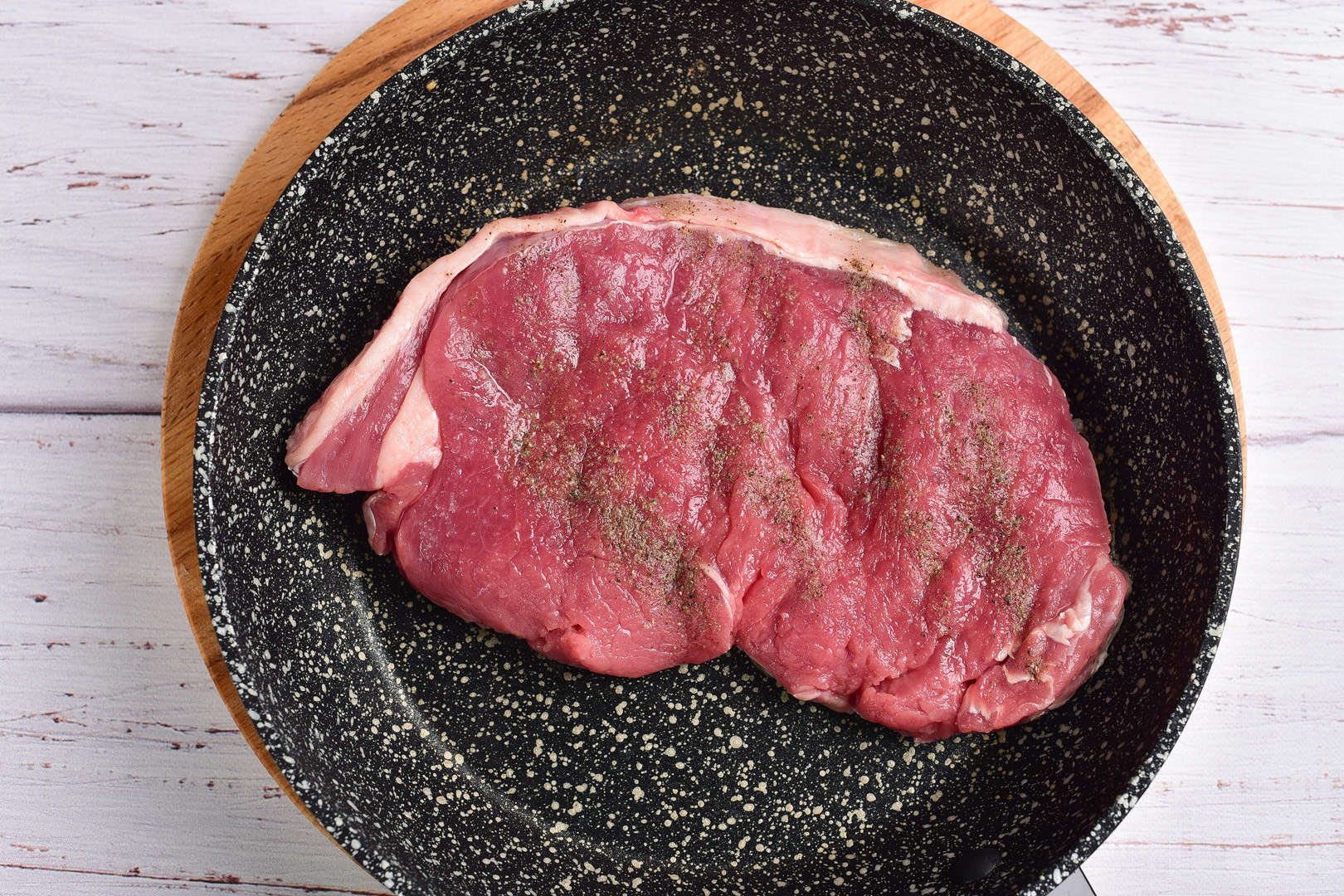 Preheat the pan well. Place steak and saute on one side over medium heat for 5 minutes. Salt a little and add pepper.