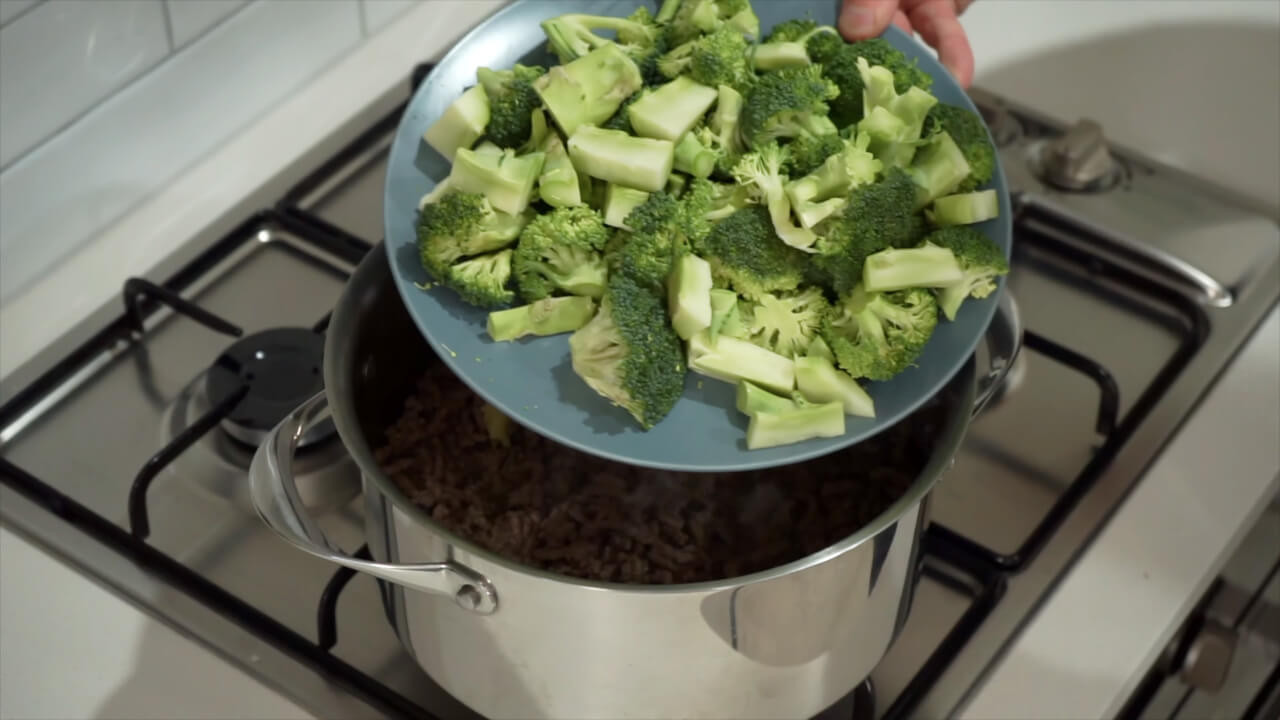 Add the chopped broccoli stems to the pan with the beef and cook for 2-3 minutes until softened. Add in the broccoli florets and continue to cook for another 2-3 minutes until the broccoli is slightly tender.