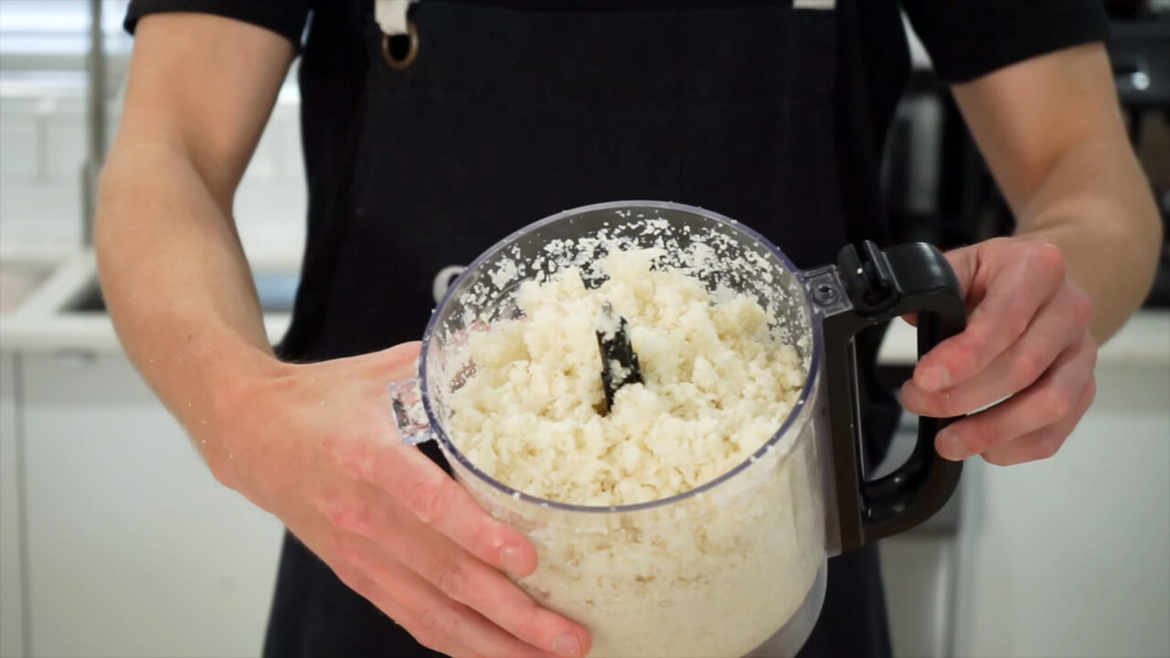 In another bowl, make the cauliflower rice by adding the cauliflower chunks to a blender and blending on high speed for about 30 seconds until it becomes a coarse mixture.