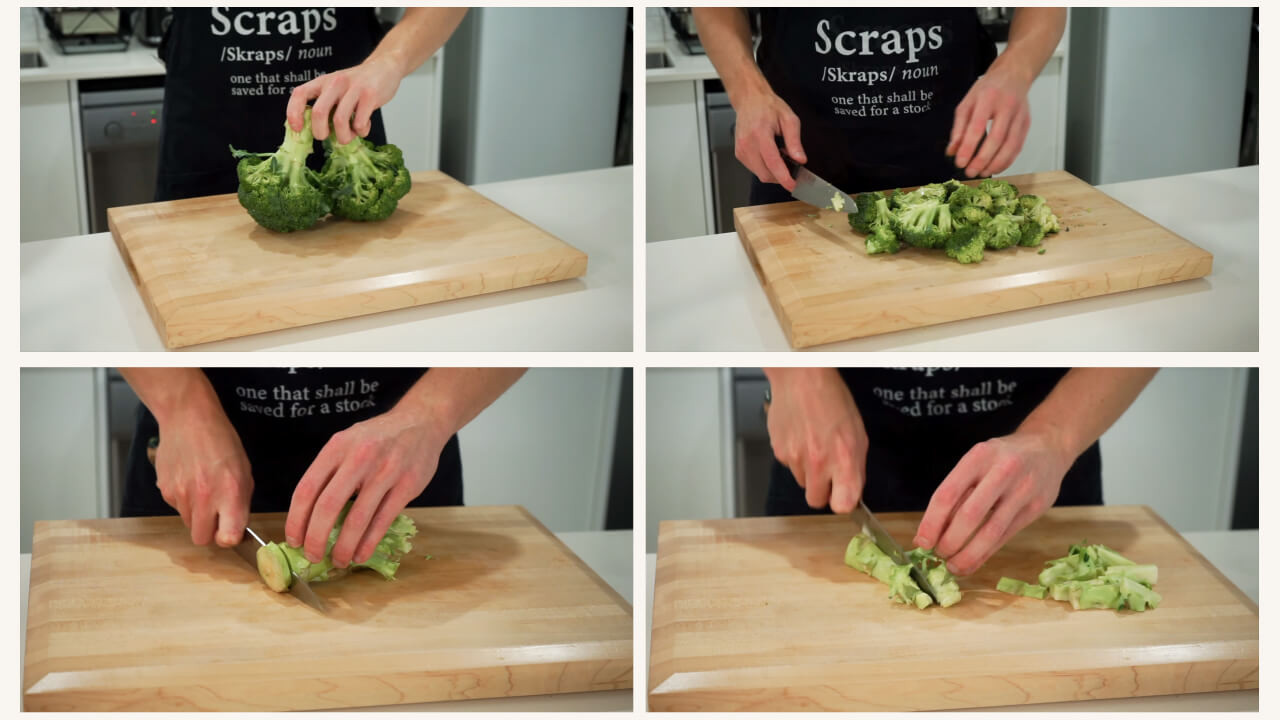 Prepare the broccoli by slicing the florets from the stem. Slice the stem in half and then into two or three strips, rotating 90 degrees and slicing into even-sized pieces.