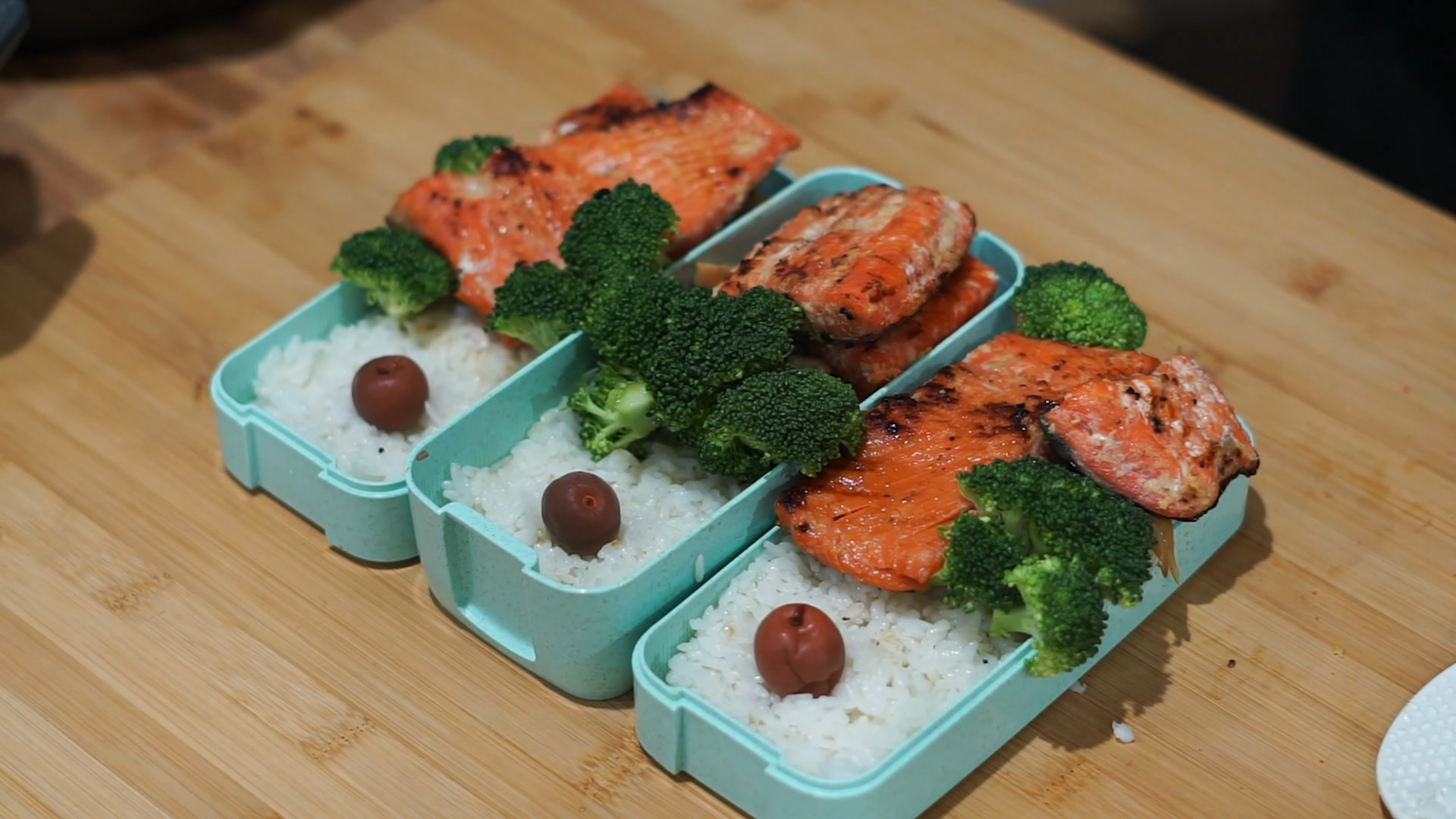 Plate your food (use a scale) with 150g white rice for each meal, split the salmon and veggies into equal parts, and add broccoli and 1 Umeboshi as an ornament.