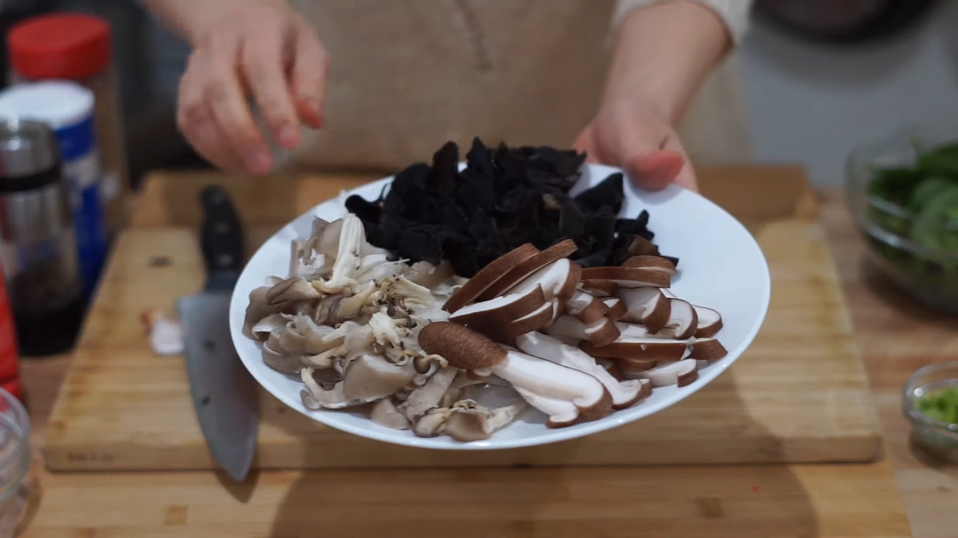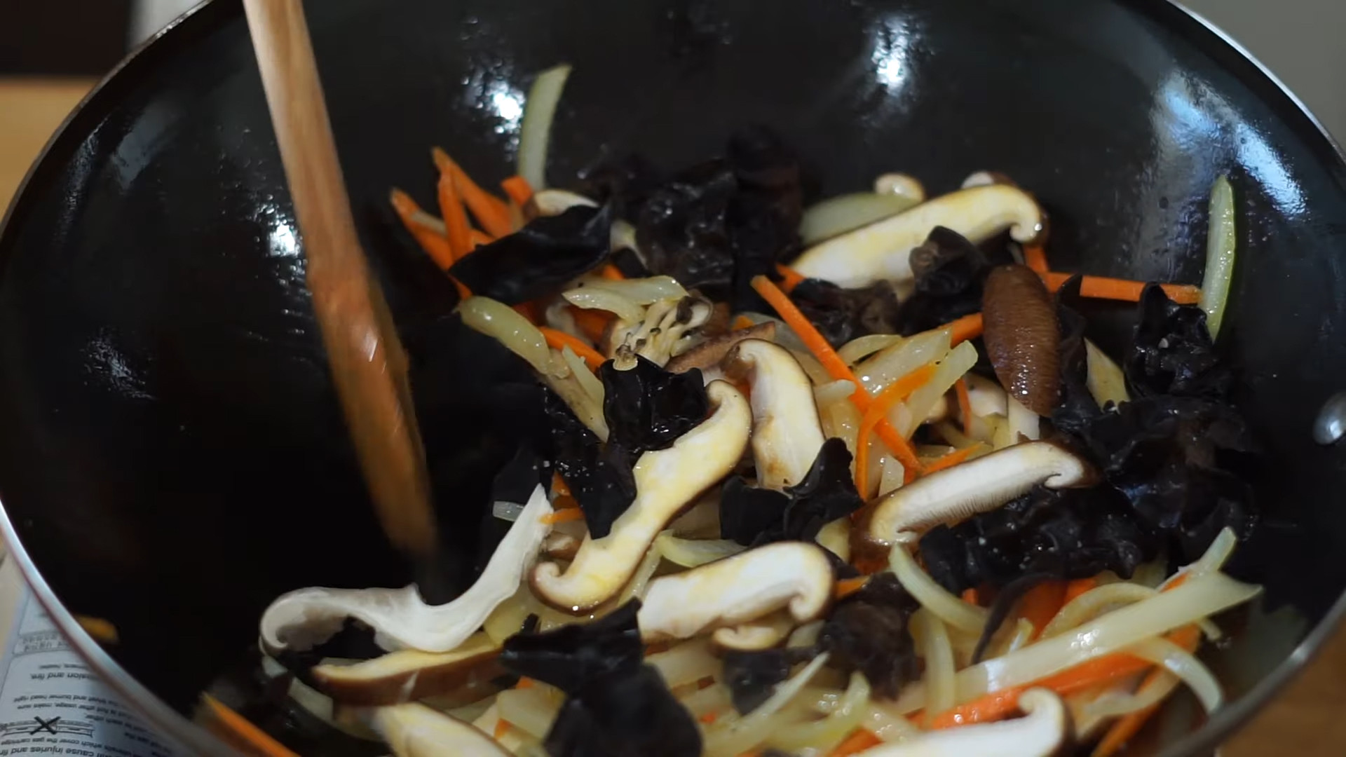 Cut into strips 1 cup shiitake mushrooms,1 cup wood ear mushrooms, and 1 cup oyster mushrooms.
