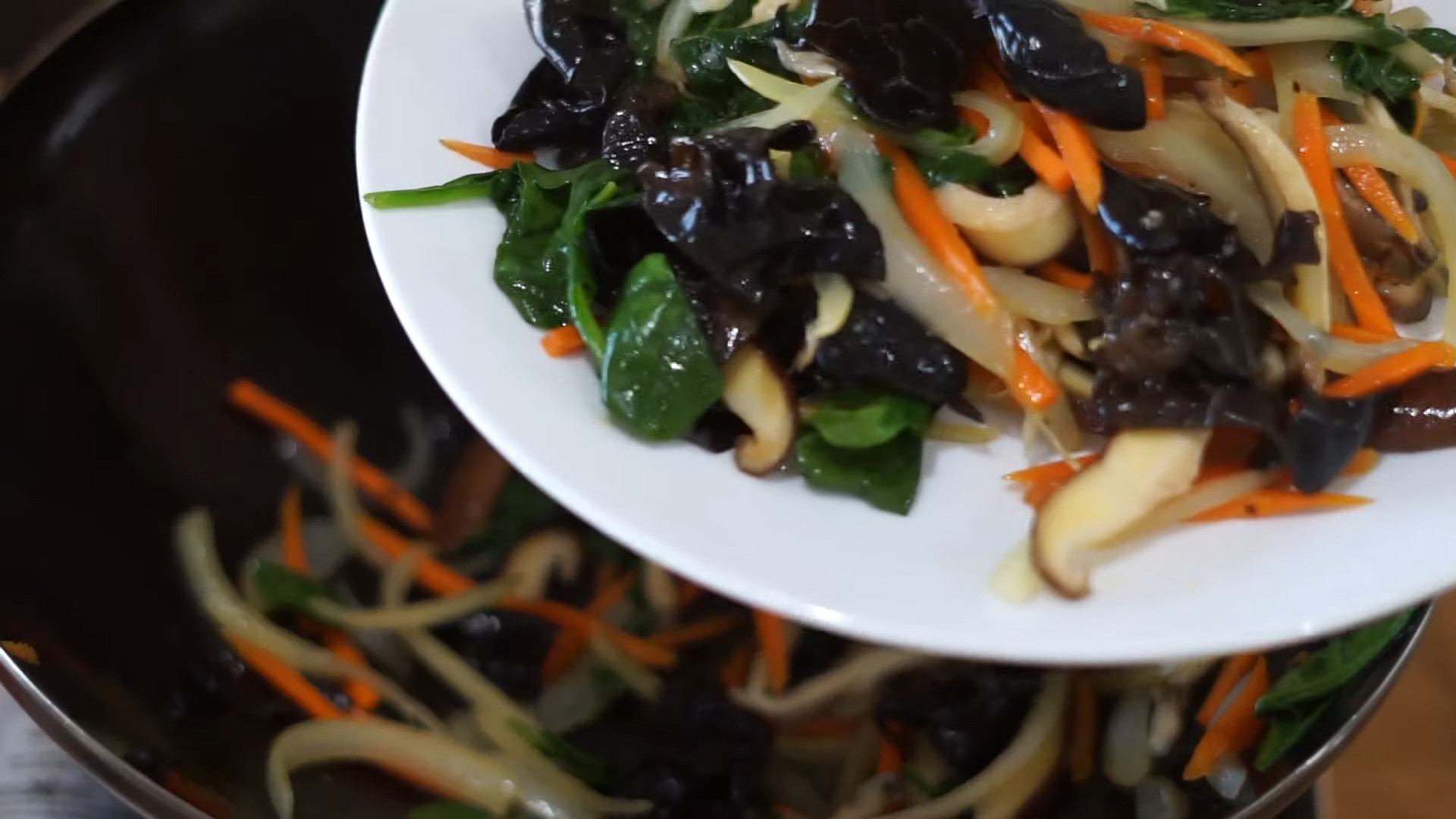 In a pan add 1 tablespoon of oil and let it heat on medium-high. Add 1 cup of onions,1/3 cup of diced carrots, 1 cup shiitake mushrooms 1 cup wood ear mushrooms, 1 cup oyster mushrooms, 1 cup of baby spinach, and 1 tablespoon of salt. Cook it for 5 minutes on medium-high heat or until the onion gets ready.