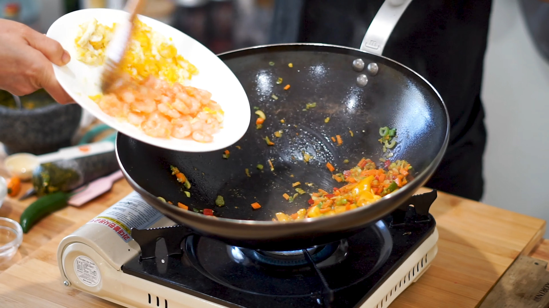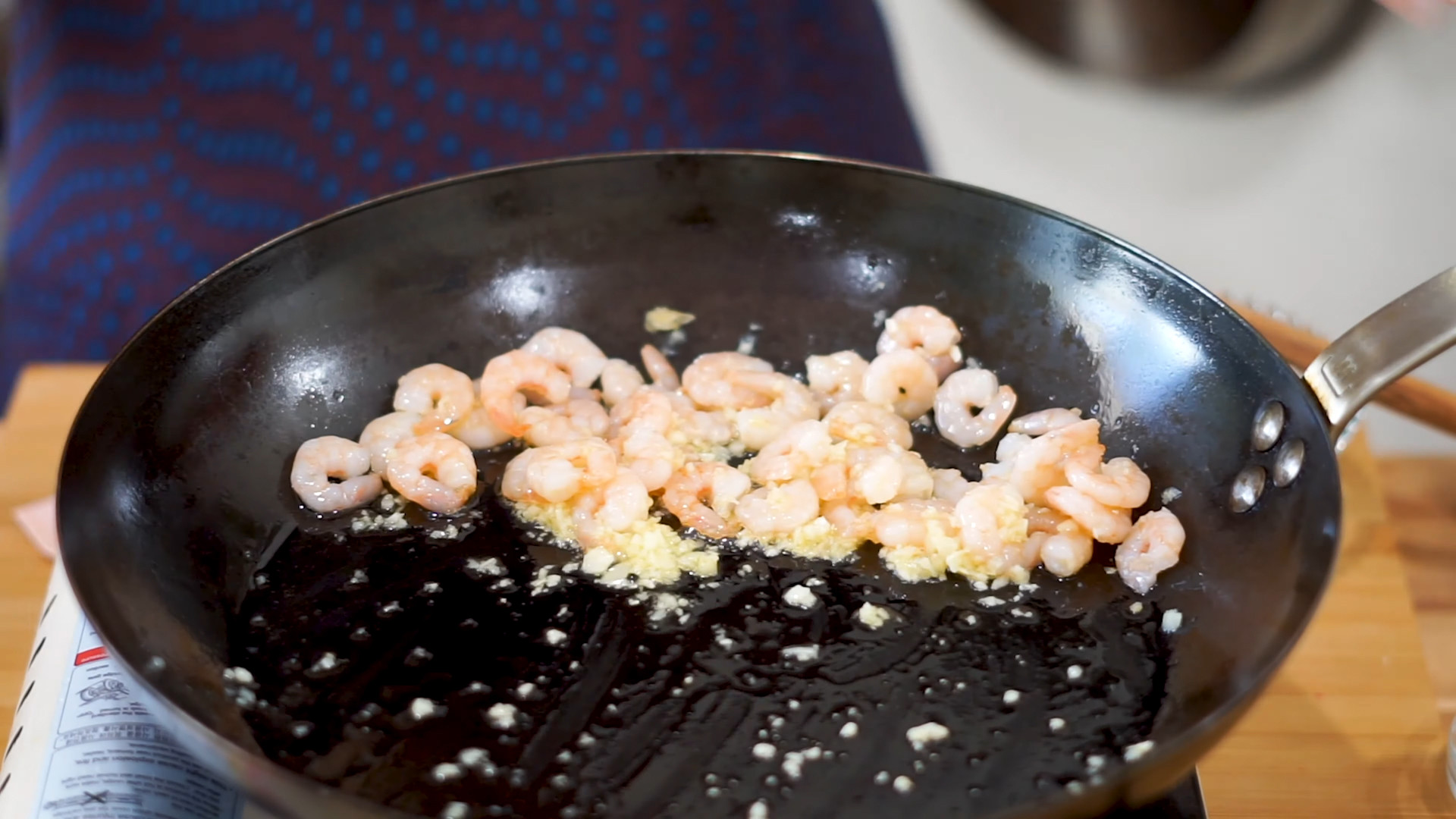 Add the Shrimp Cocktail into the same tan, fry everything up for 2 minutes.