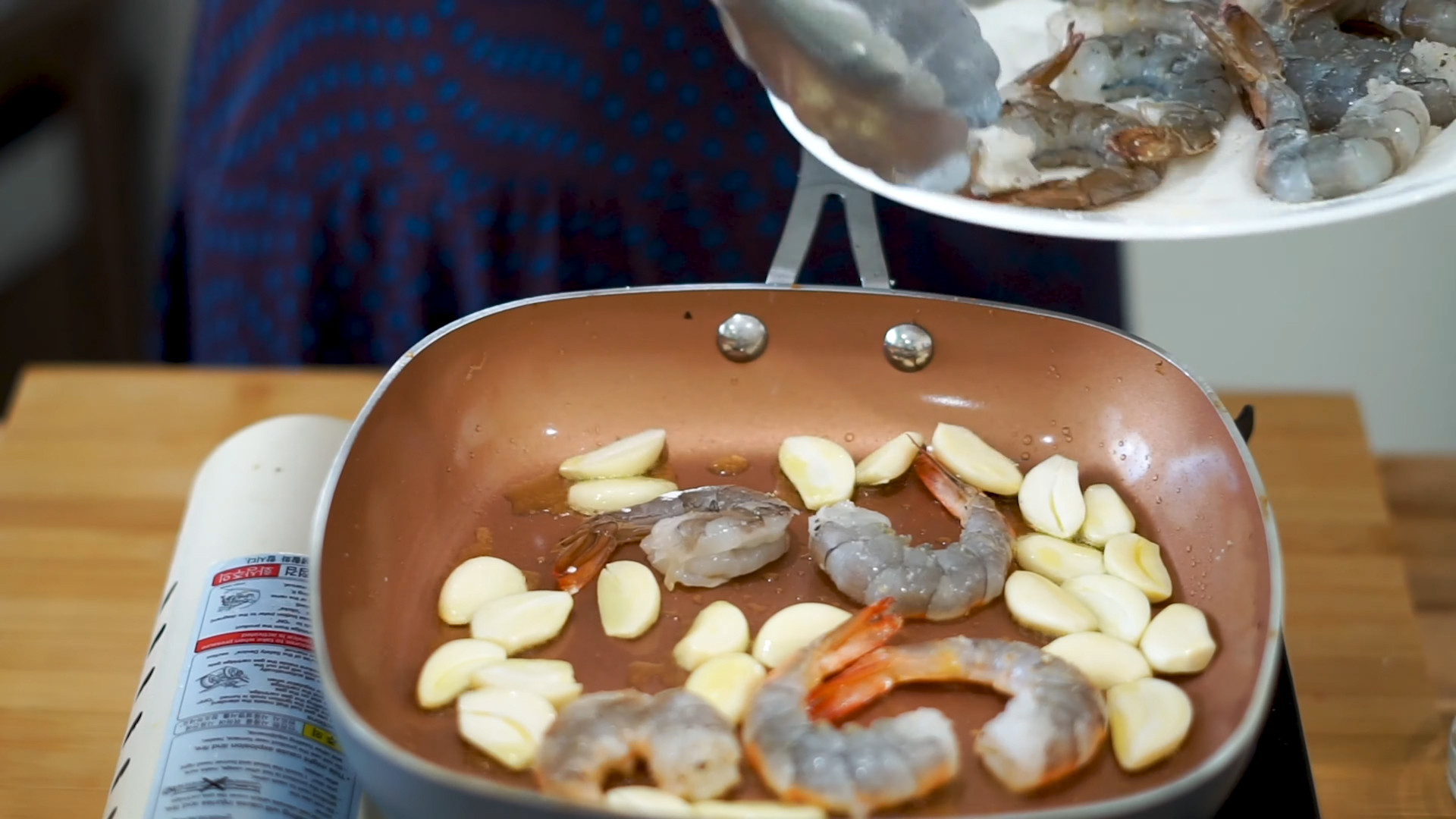 Put one 1 Tablespoon of olive oil in a middle heat pan, Cook 230g raw shrimps without a shield with 1 cup whole head of garlic.