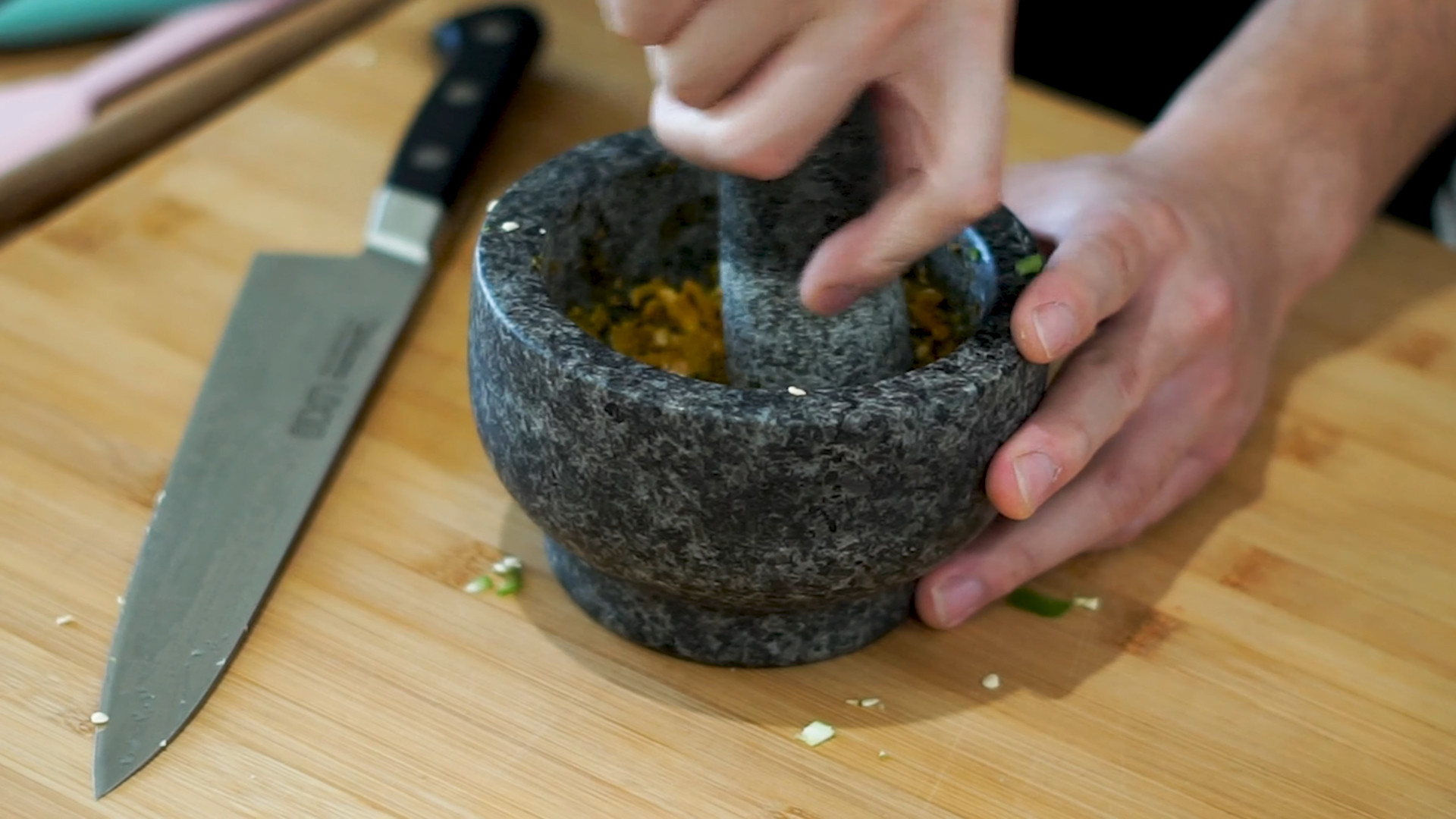 In a mortar add 1 Tablespoon of chopped red bell peppers, 1 Tablespoon of chopped yellow bell peppers, 1 Tablespoon Jalapeño, 1 tablespoon of minced garlic,1 tablespoon of curry powder, 1 tablespoon of fish sauce, grind it up for 2 minutes.