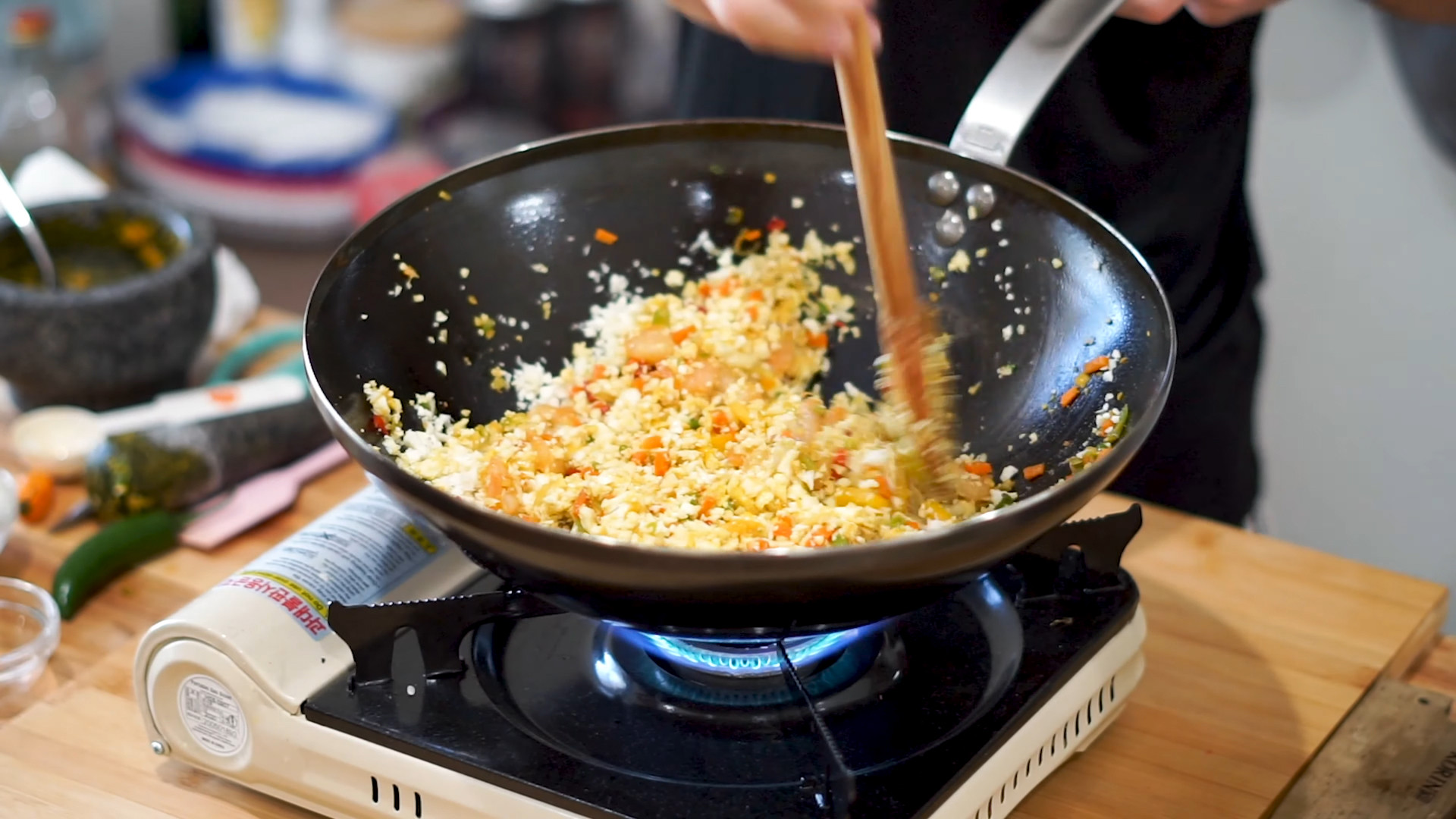 Sauté in the same pan 1 cup of chopped carrots, 1 cup of chopped yellow bell peppers, 1 cup of chopped carrots, 1 cup of chopped green onion, 1 cup of chopped red bell peppers with the ground cauliflower, mixed all together.