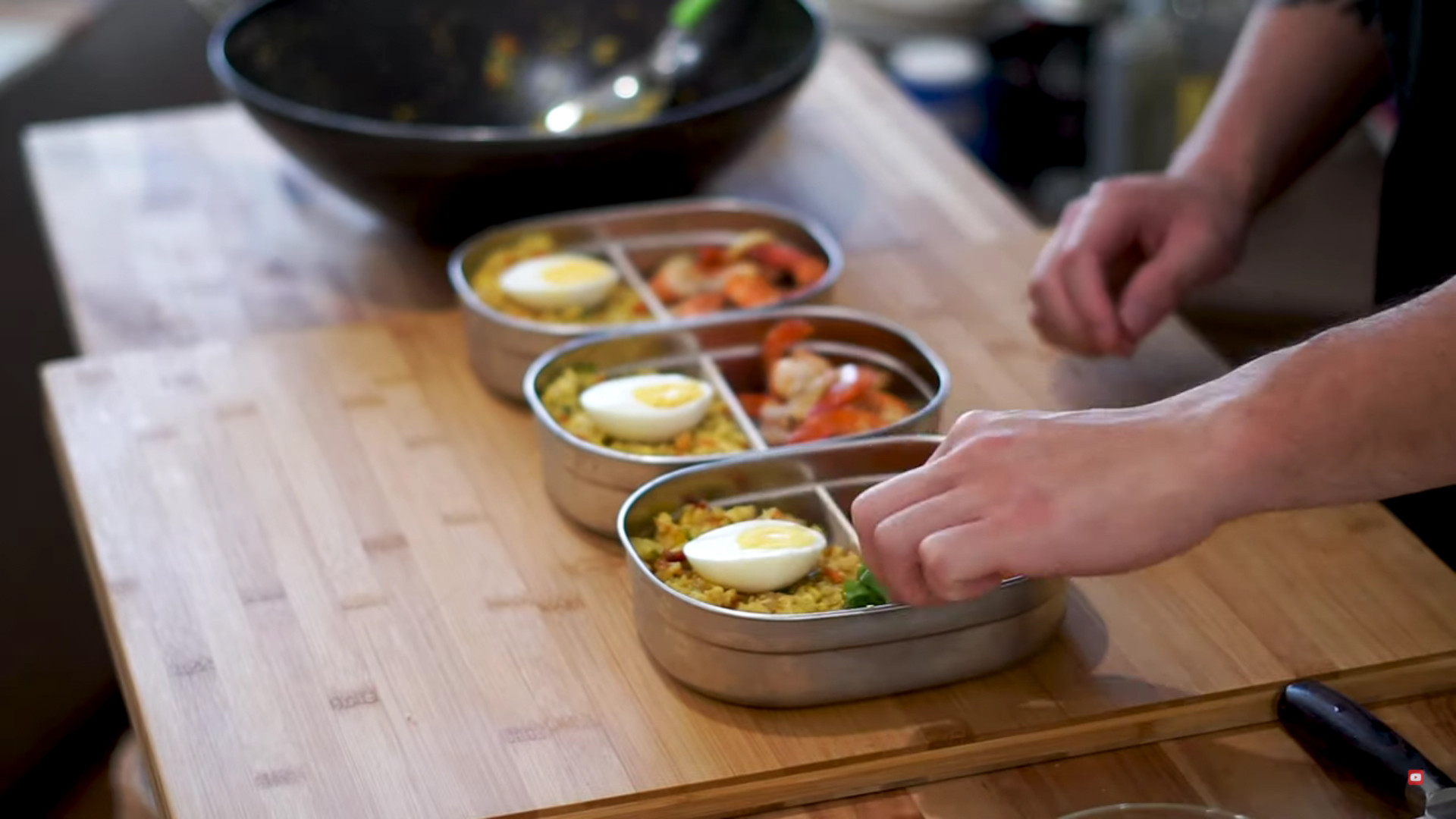 Plate your food with half of the cauliflower rice, half of the shrimp, and place half an egg at the top.