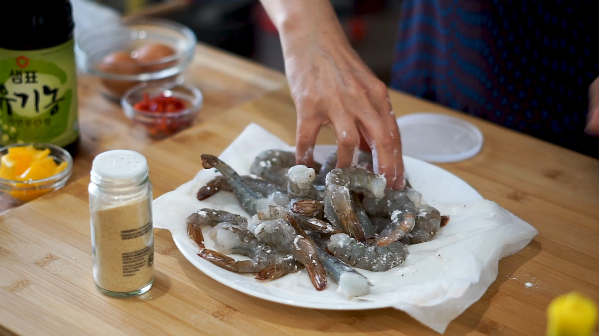 Place 230g raw shrimps without the shield in a plate, add 1 Tablespoon corn starch, salt&pepper to taste, and mixed all together.