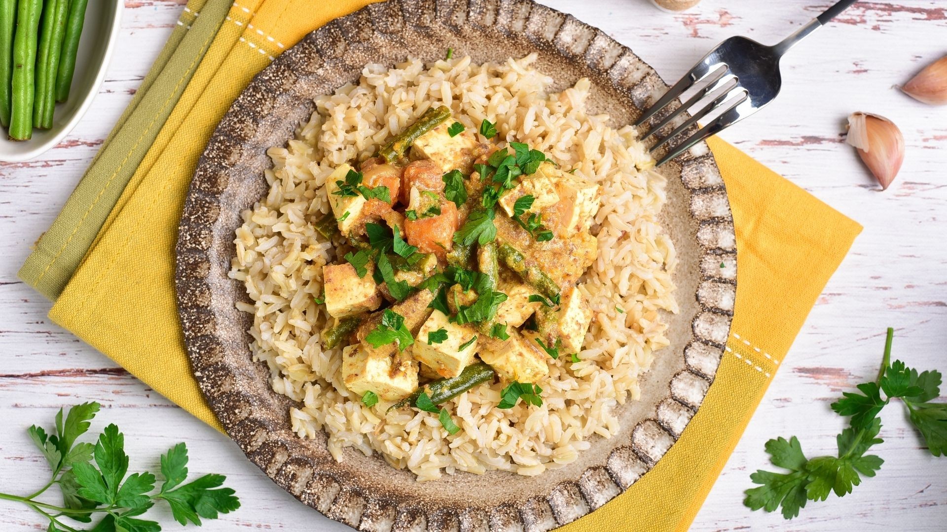 Top with a serving of rice and top with vegetables with tofu and aromatic curry sauce. Garnish everything with finely chopped fresh parsley or other herbs. The dish is ready and ready to serve!