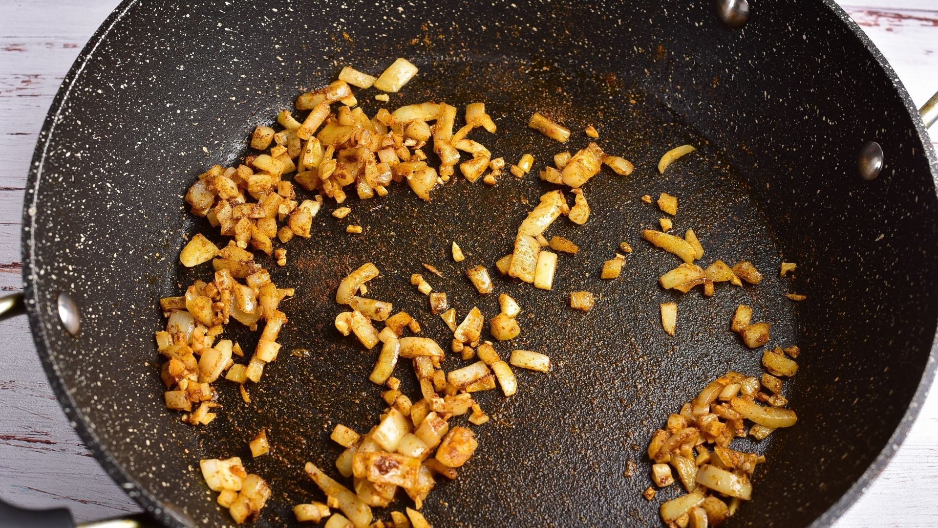 Melt the coconut oil in a frying pan and fry the onion and garlic over low heat for 4 minutes, then add the curry powder and stir with a spatula.