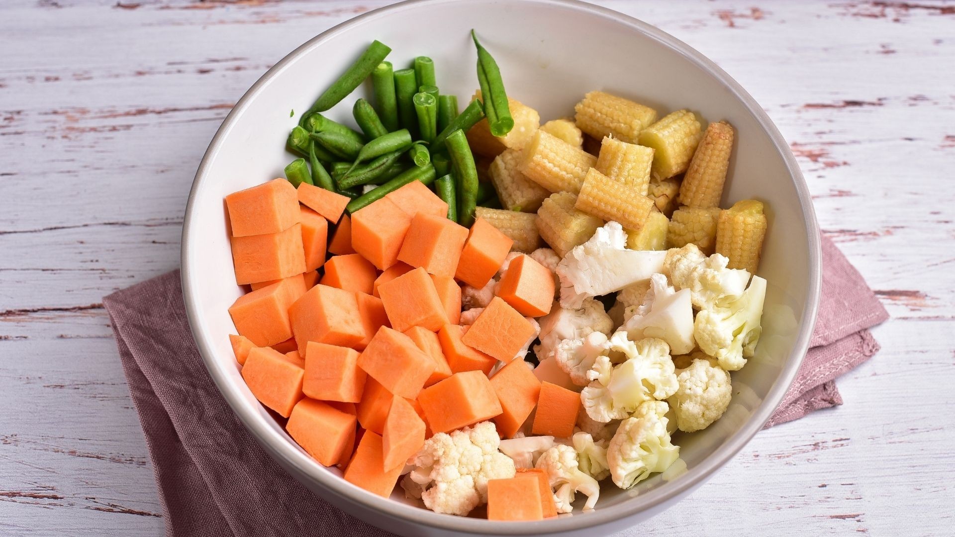 Immediately cook brown rice in salted water. Peel the sweet potato and cut into cubes. Disassemble the cauliflower into inflorescences. Cut the green beans and corn into pieces. Also peel the onion and garlic, chop finely.