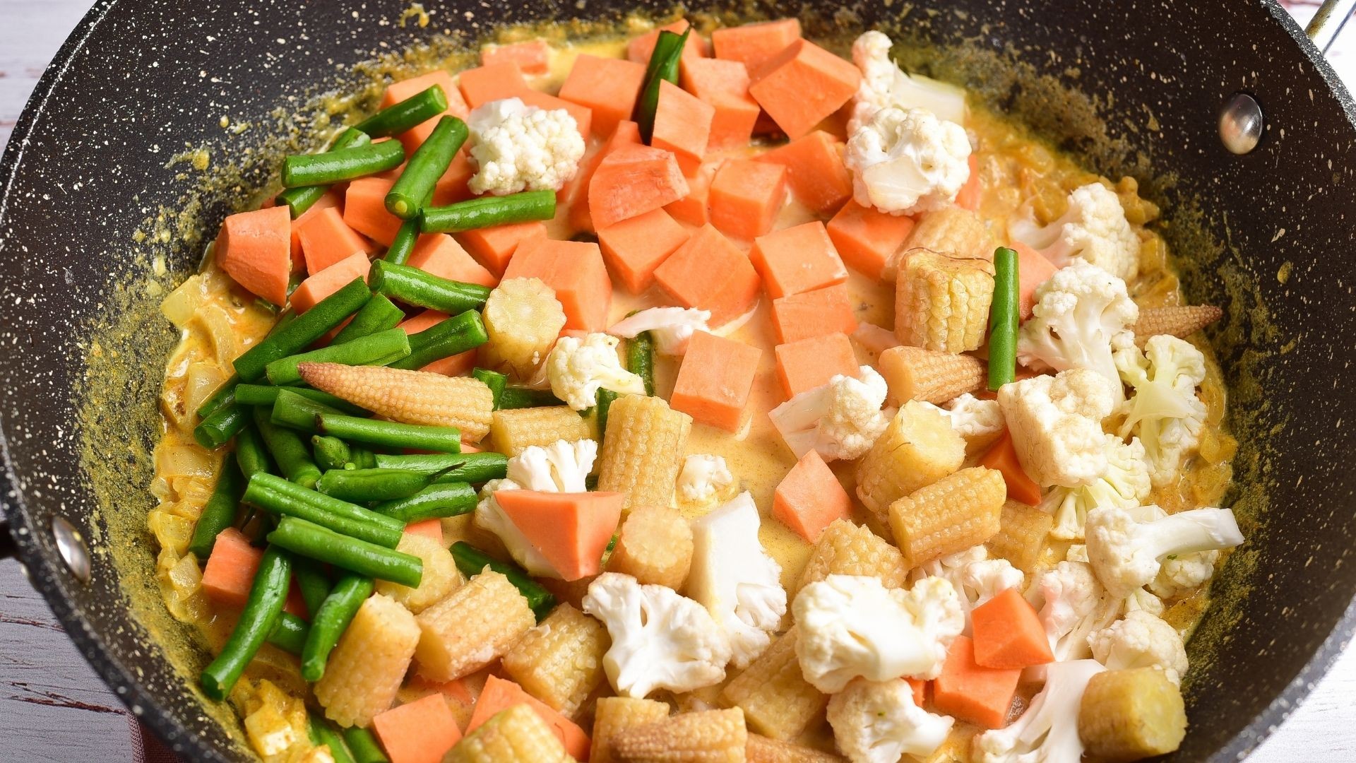 Pour in coconut milk and water (100 ml), stir. Place the green beans, sweet potatoes, cauliflower, and corn in the skillet. Stir and cook everything together for another 10 minutes on low heat.