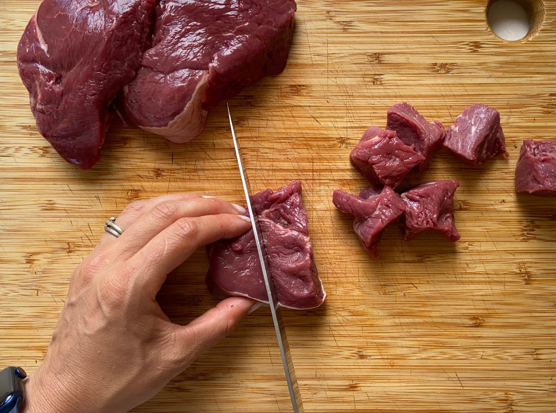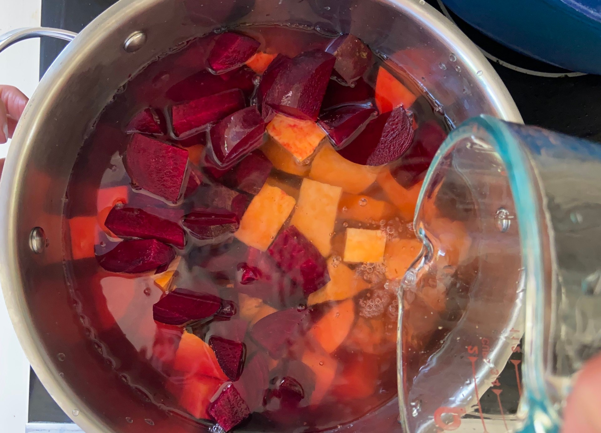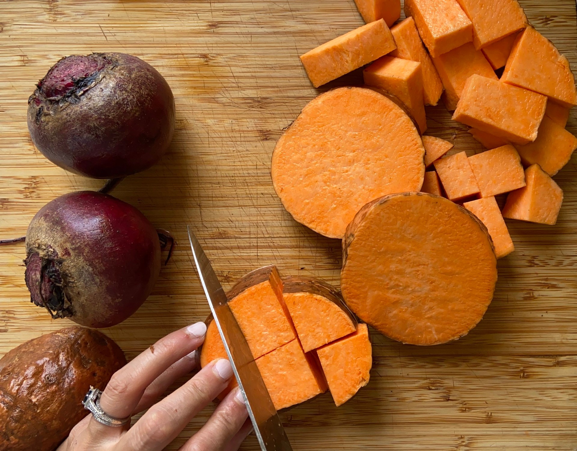 Meanwhile, wash the sweet potato and beetroot and dice them into 3cm pieces.