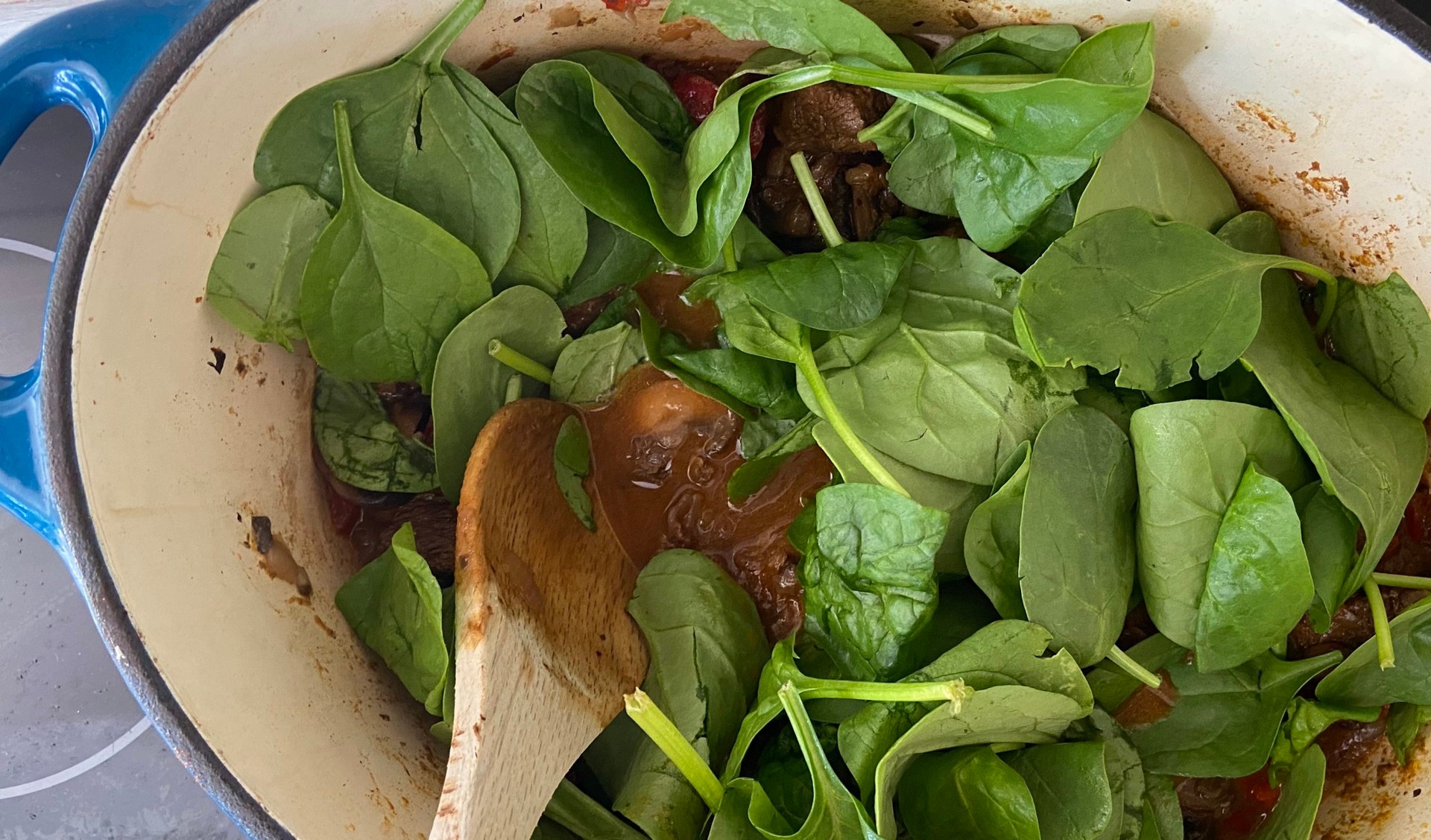 Once the beef is tender, add the coconut cream and spinach and stir to combine.