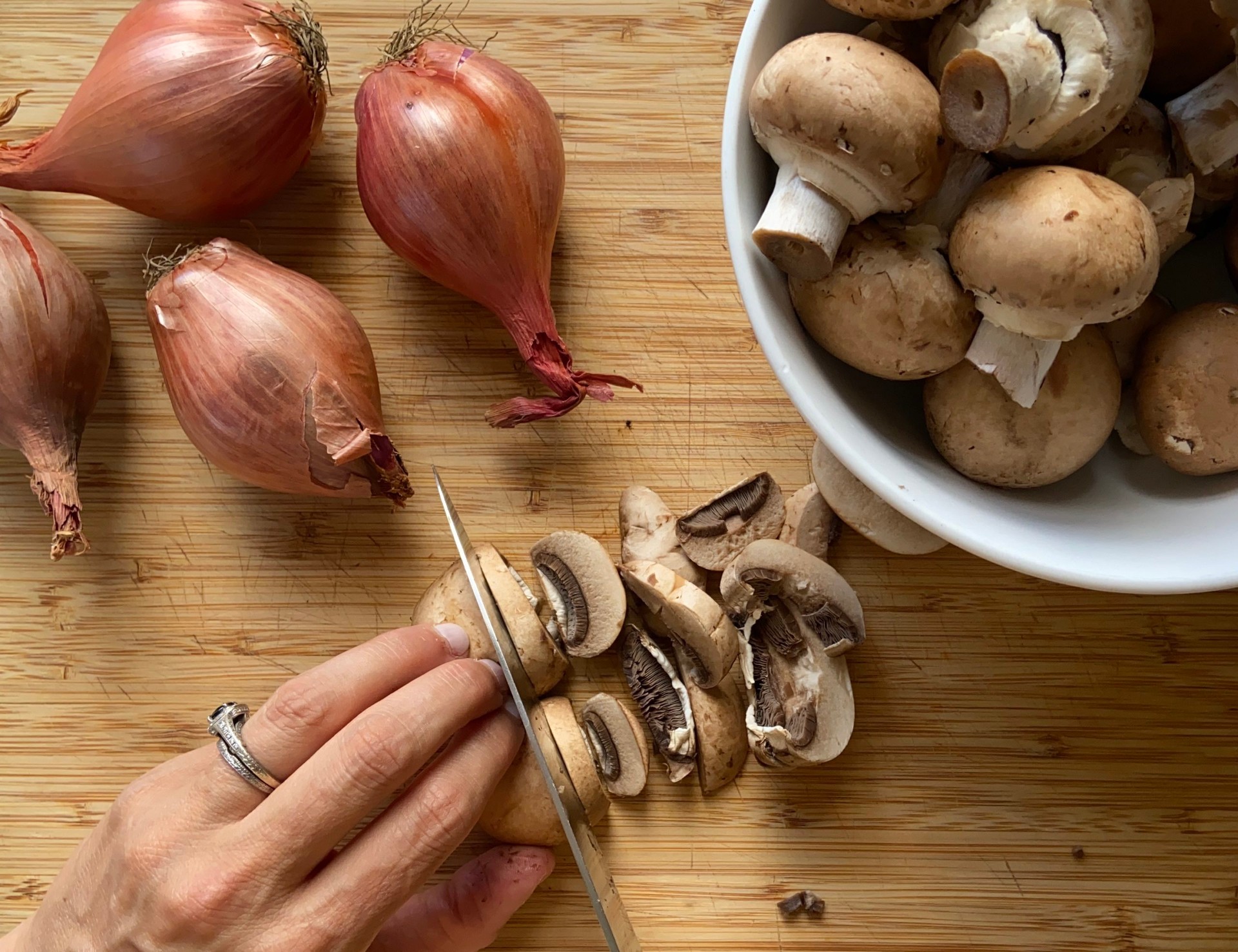 Slice the mushrooms thickly and dice the red capsicum. Roughly slice the shallots.