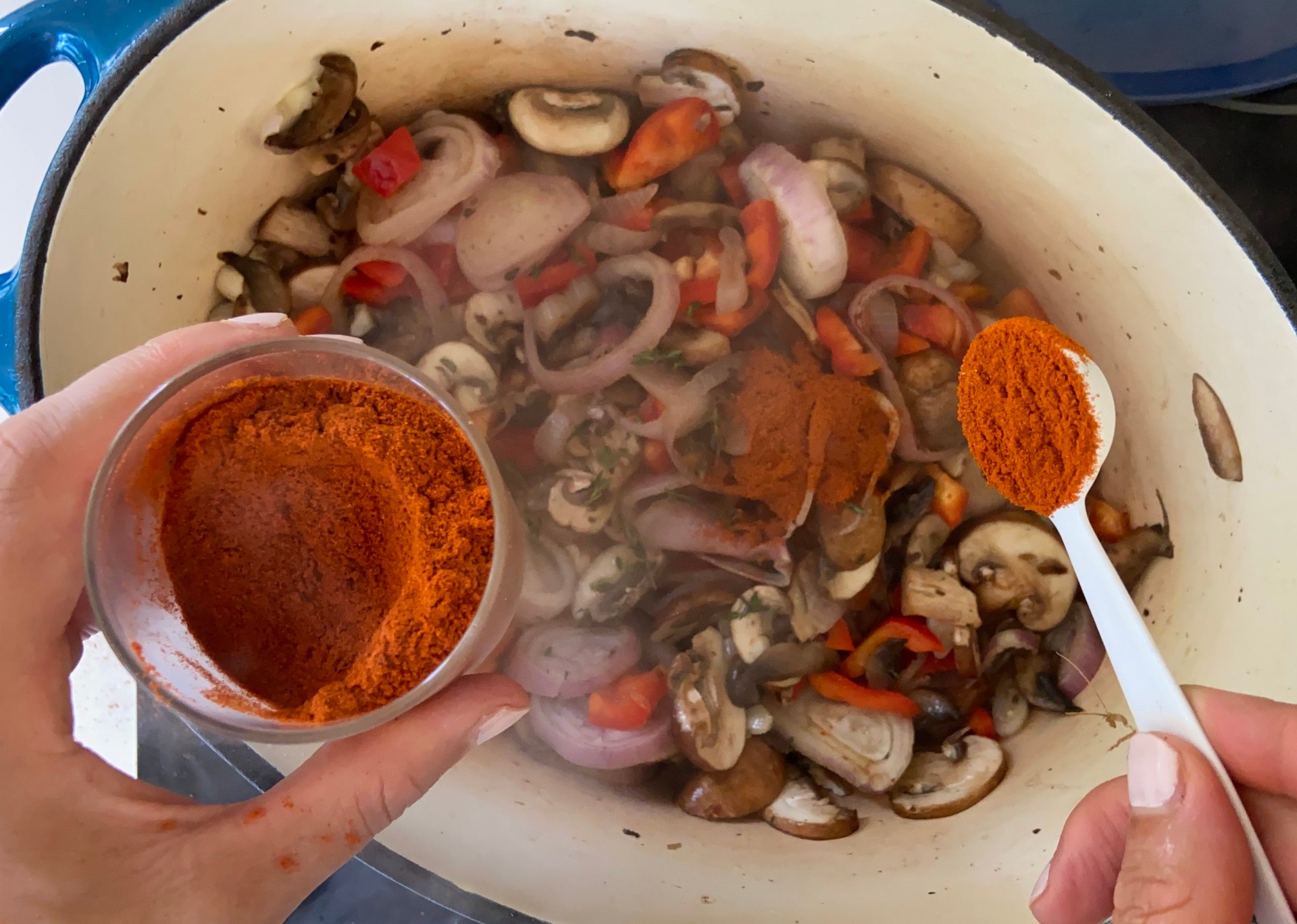 Add 4 garlic cloves, paprika, thyme and mustard. Sautee until fragrant.