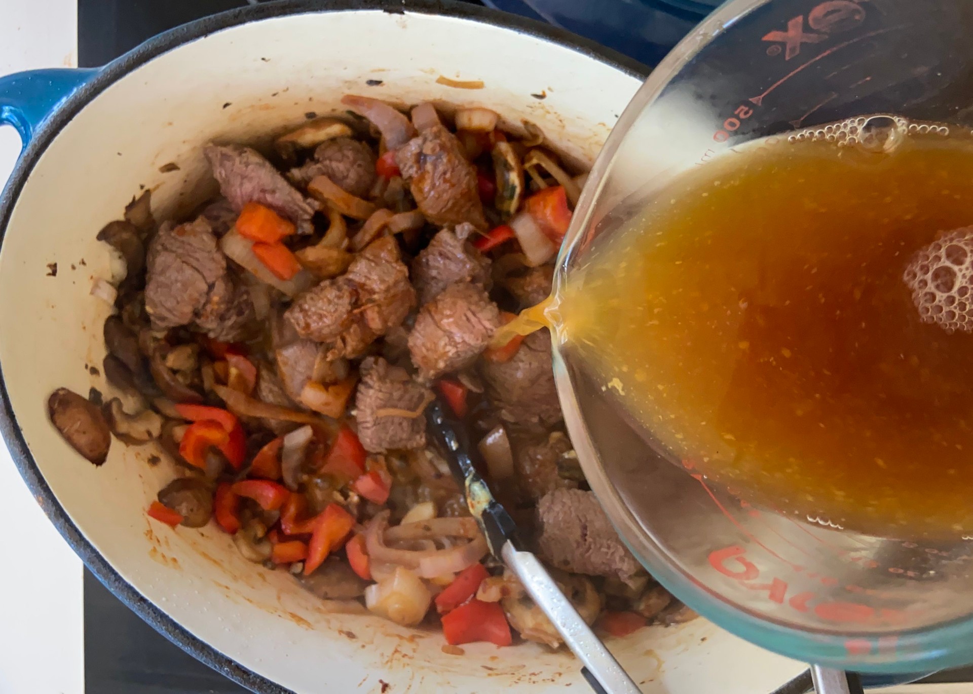 Return the beef to the pot and add the bone broth. Cover with a lid and turn the heat down to low-medium. Simmer gently for 2 hrs (check at 1.5 hrs) until the beef falls apart easily. Add more broth if needed.