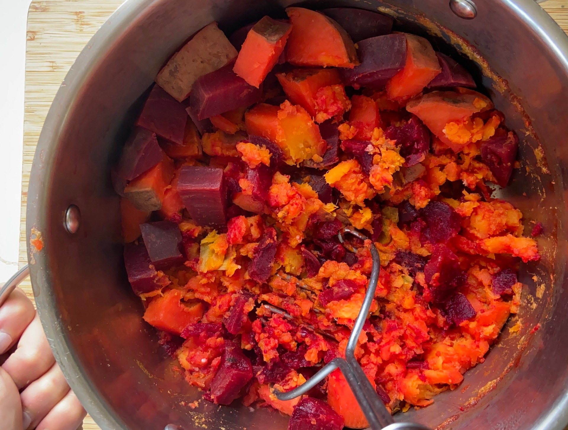 Drain well, then return the sweet potato and beetroot to the pot. Add 1 crushed garlic clove and season with salt and pepper to taste. Mash the sweet potatoes to your desired consistency.