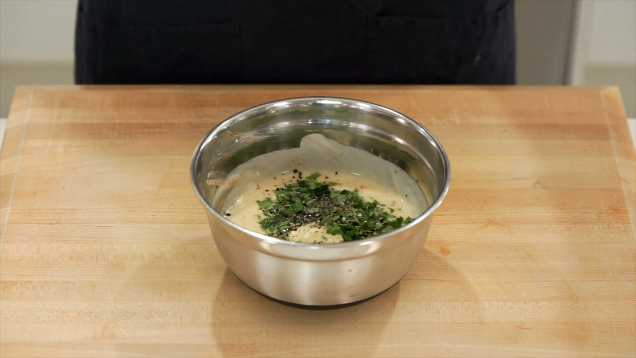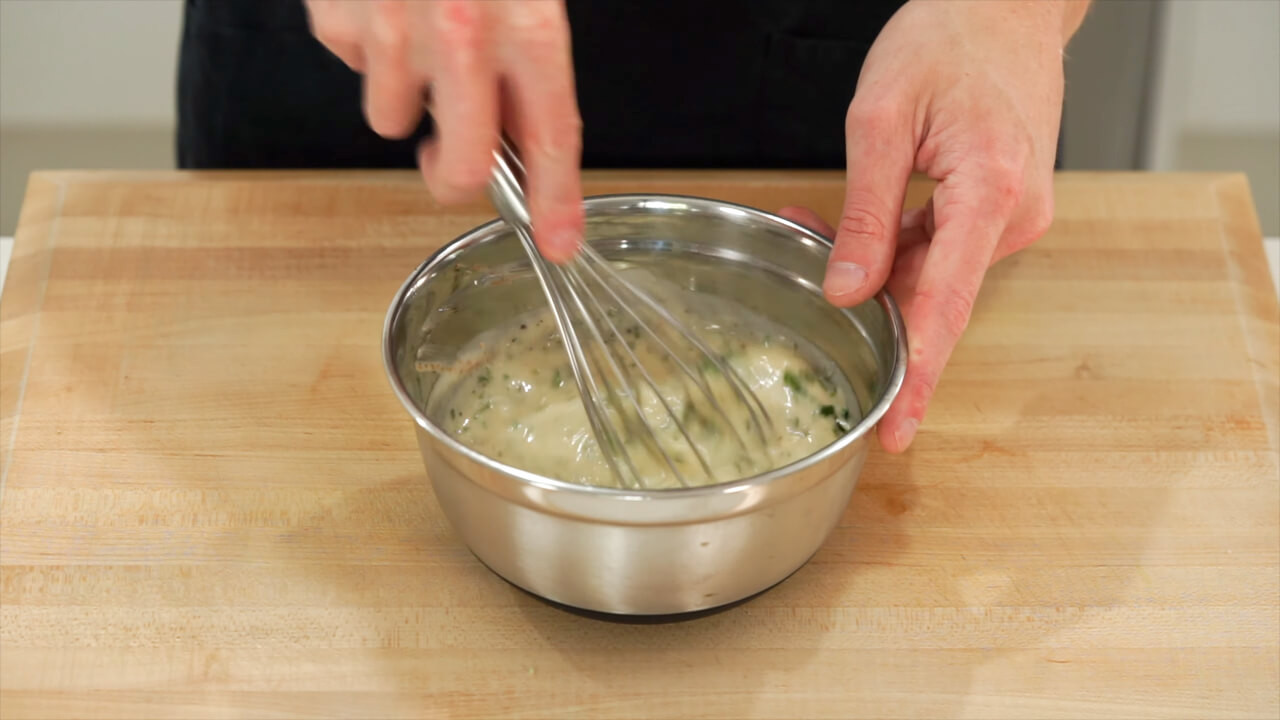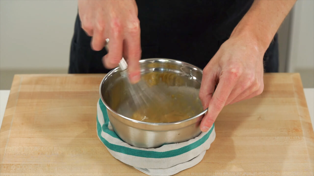 Create a nest with a damp tea towel and place the bowl securely in it. Vigorously whisk while slowly pouring in 200 milliliters of any neutral flavored oil to create an emulsion or a thick face mayonnaise.