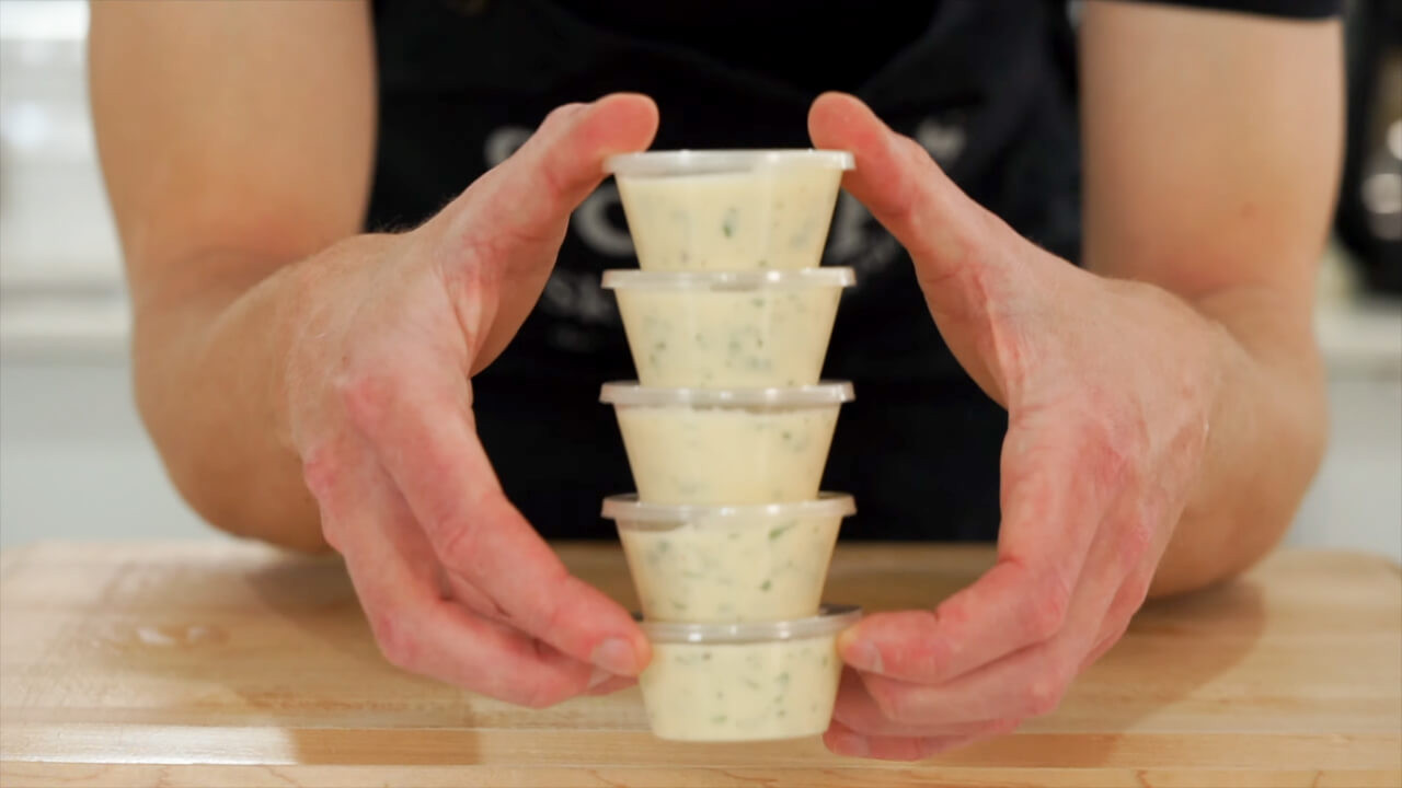 Portion the coriander lime sauce out into five little containers, about 80 milliliters each. Place on the lids and store in the fridge for up to five days.