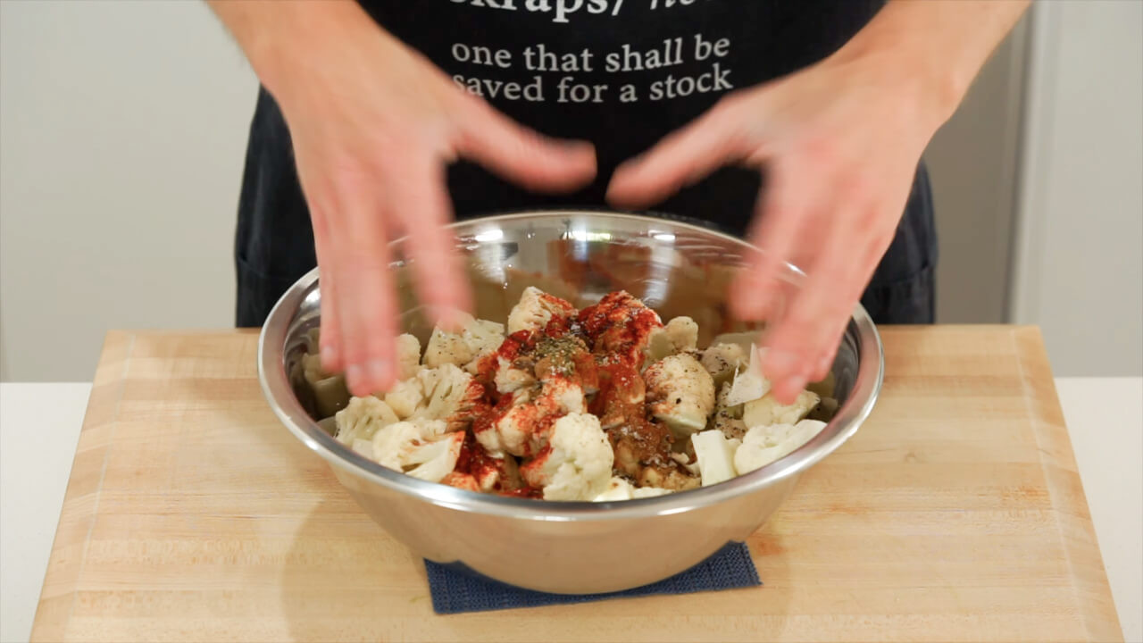 Spread the cauliflower florets and the core on a baking sheet. Drizzle with olive oil and sprinkle with smoked paprika, ground cumin, garlic powder, salt, and pepper. Mix well.