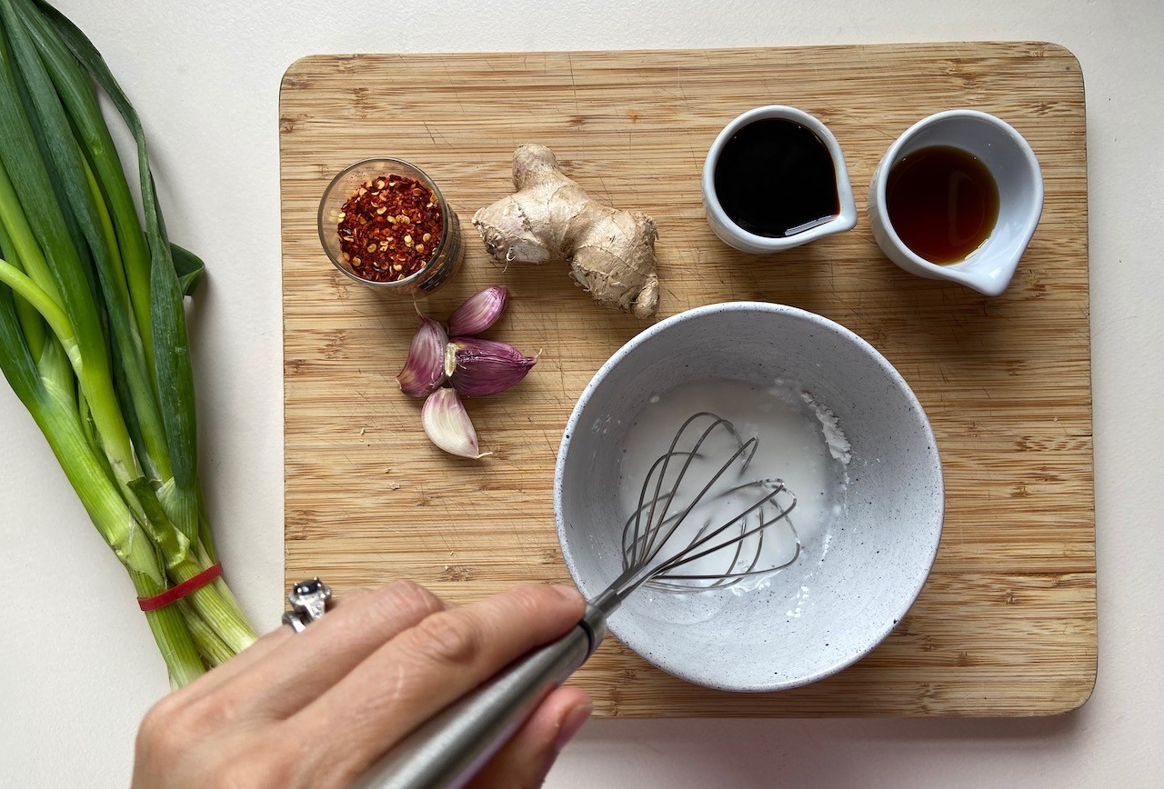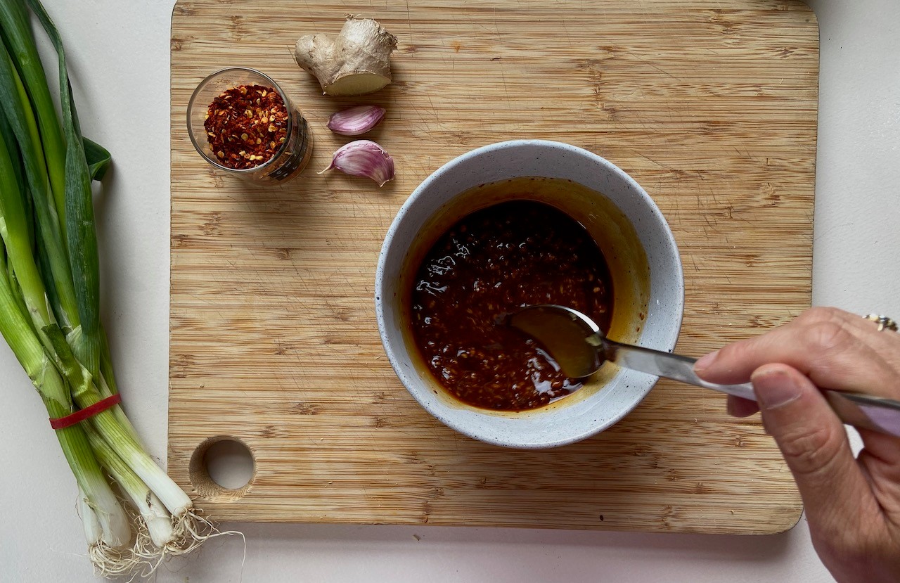 Add to the sauce mixture along with the chilli flakes, if using. Whisk until well combined.