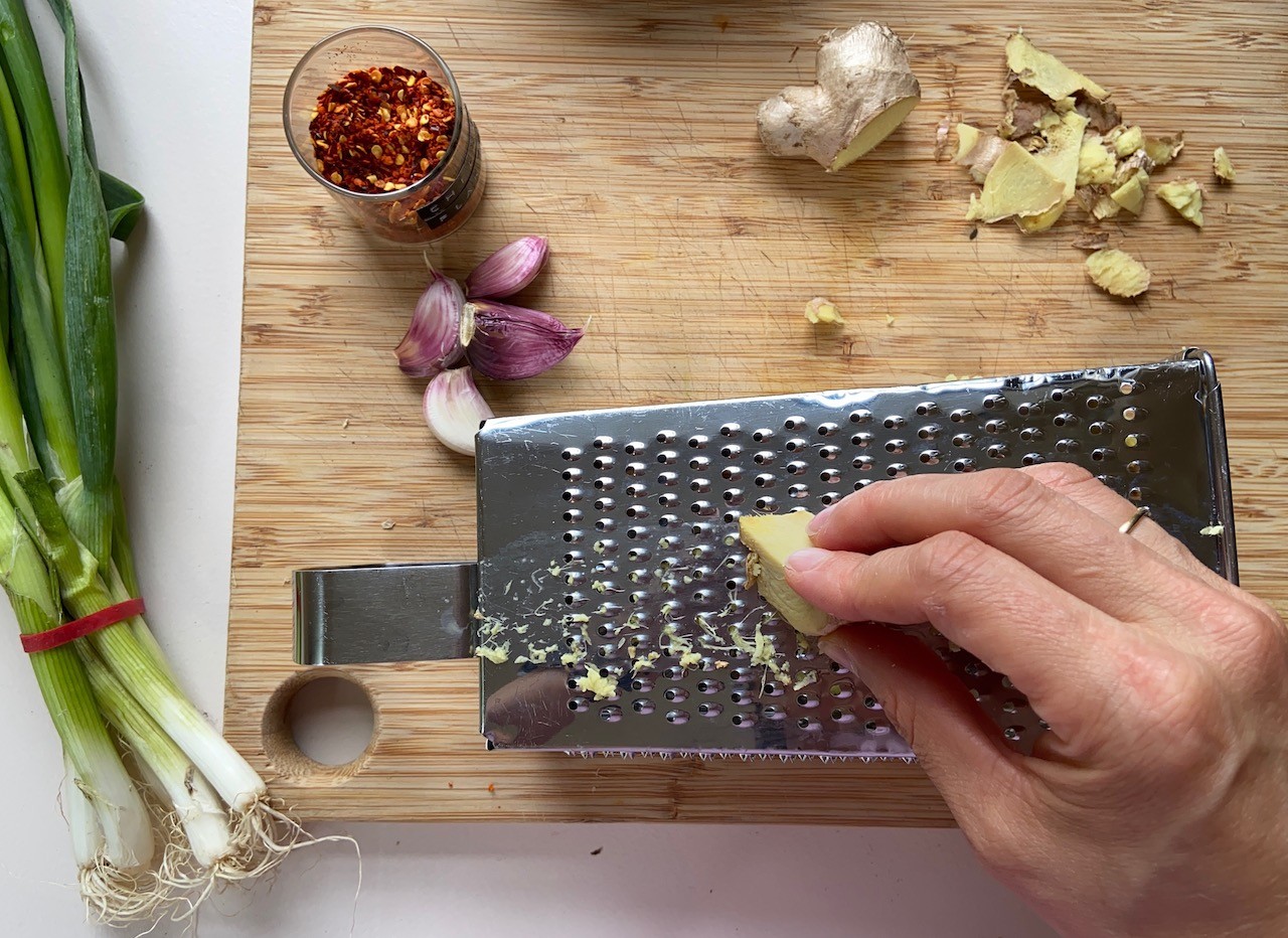 Peel the outer layers of your spring onions and slice off the ends. Slice the spring onions just above the whites and then slice in half.
