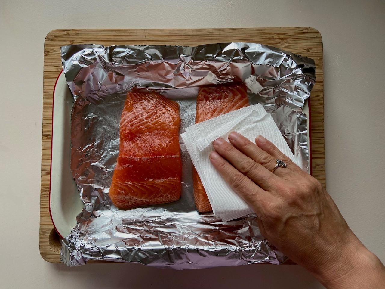 Line a tray with foil and lightly spray with olive oil. Place your salmon fillets skin side down on the prepared tray and pat dry with a paper towel to remove any moisture.