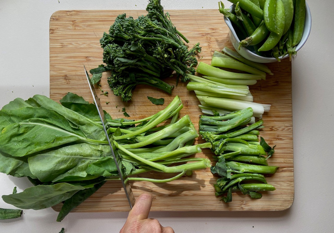 Turn your grill on high. Prep your green vegetables. Chop the broccolini and Chinese broccoli in half dividing the leaves and steams.