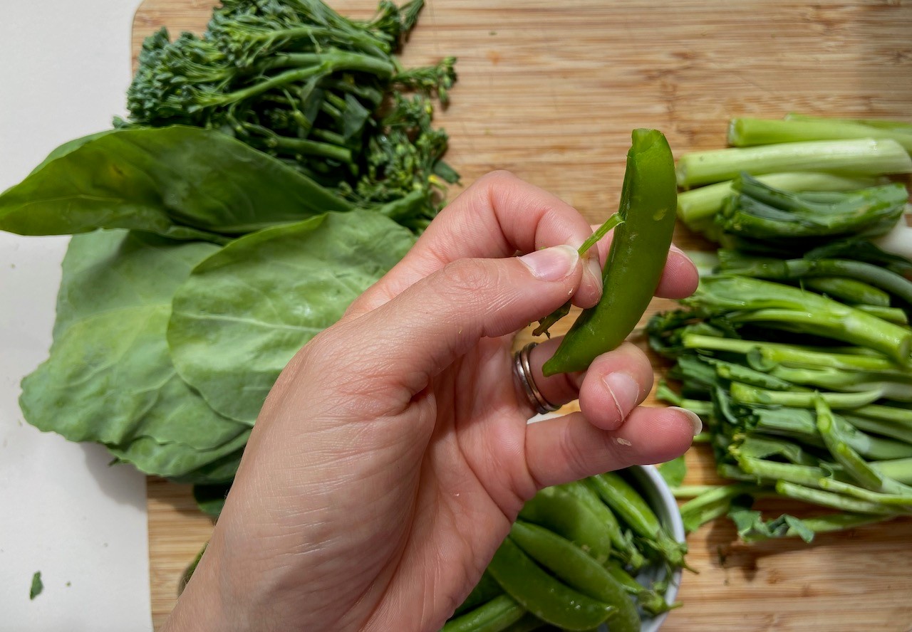 Peel that stringy part off sugar snap peas, keeping the peas in the pod. Set your green vegetables aside.