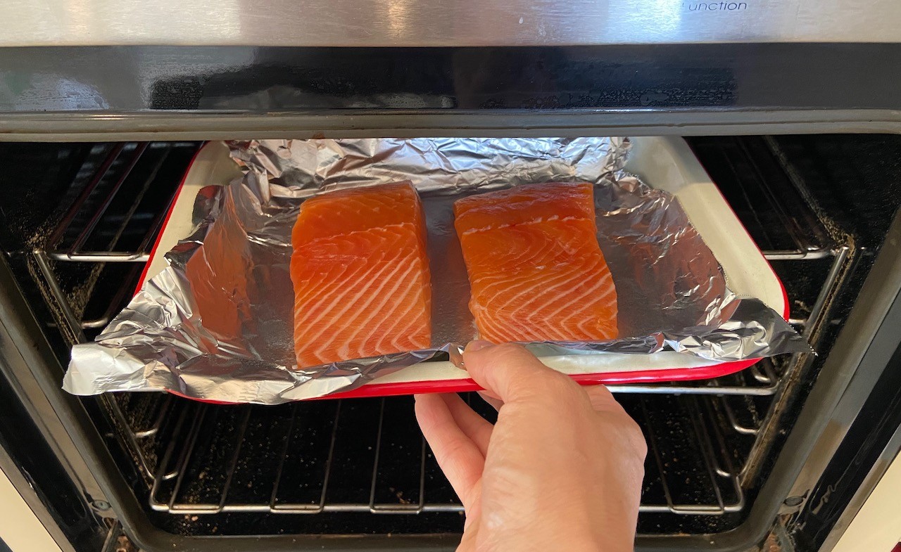 Place your salmon under the grill in your oven and bake for 8 minutes or until just cooked through. Remove and set aside.