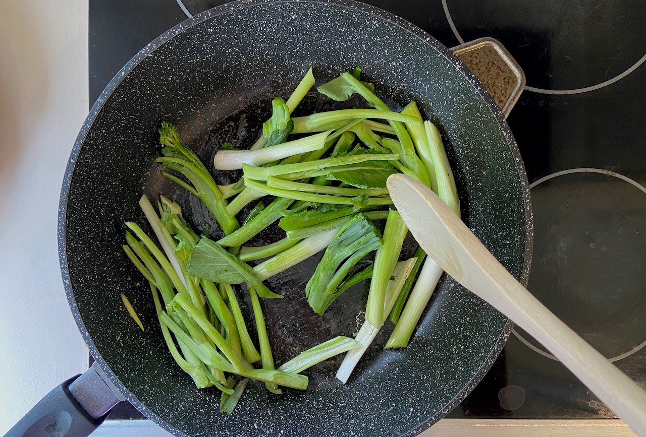 Heat the peanut oil in a pan over medium to high heat. Place the spring onions and the steams of the broccolini and broccoli and stir-fry for 2 minutes.