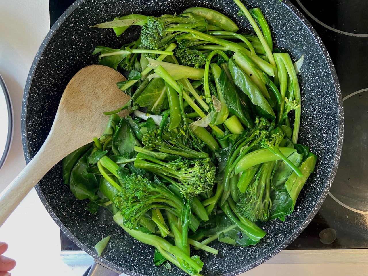 Add the leafy green tops and sugar snaps. Cook stirring for another couple of minutes until wilted.