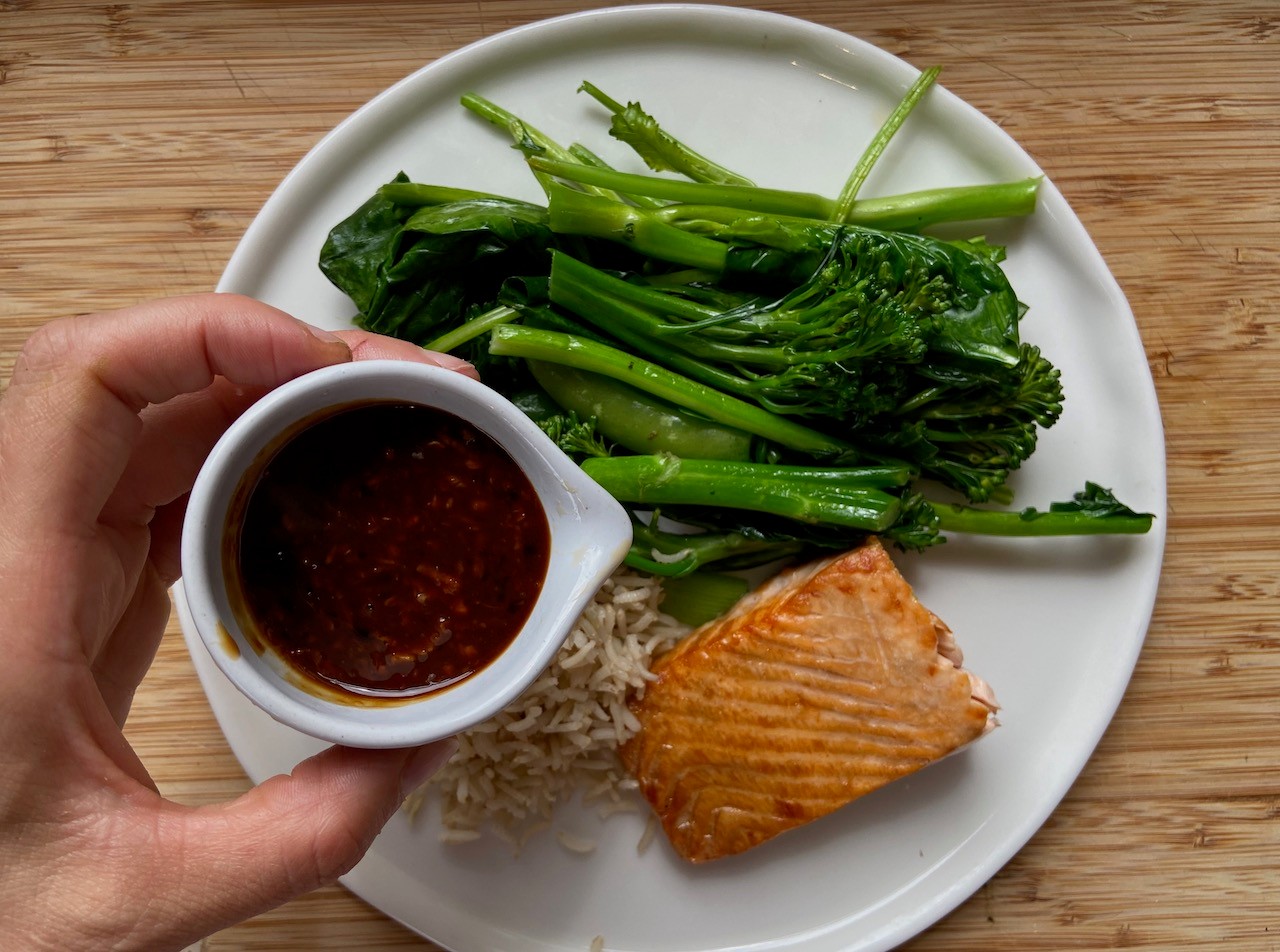 To finish, place the sauce mixture in the microwave for 30 seconds. Slice each salmon fillet in half. Plate up with greens and a piece of salmon. Drizzle the sauce over the salmon and vegetables.