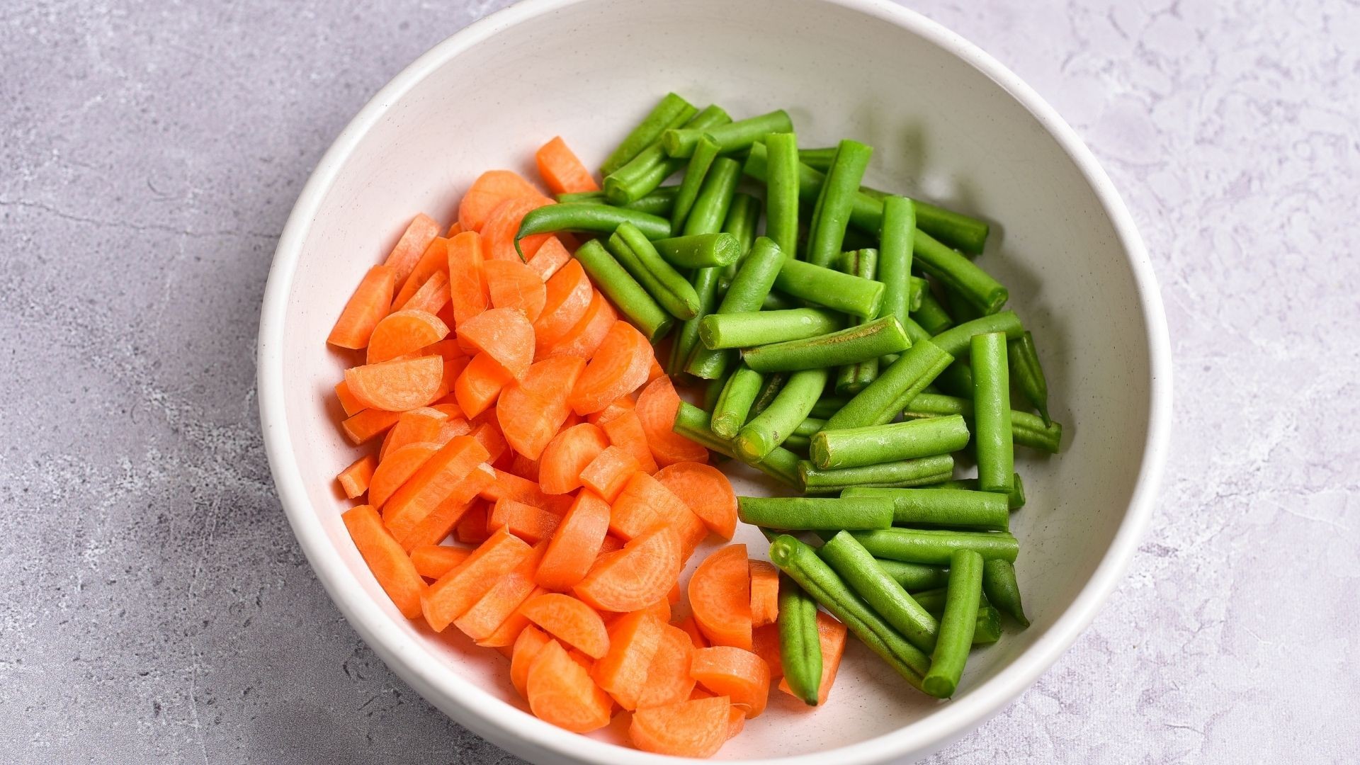 Put green beans, carrots in a hot dry frying pan, add fresh peas and fry everything on low heat for 2-3 minutes.