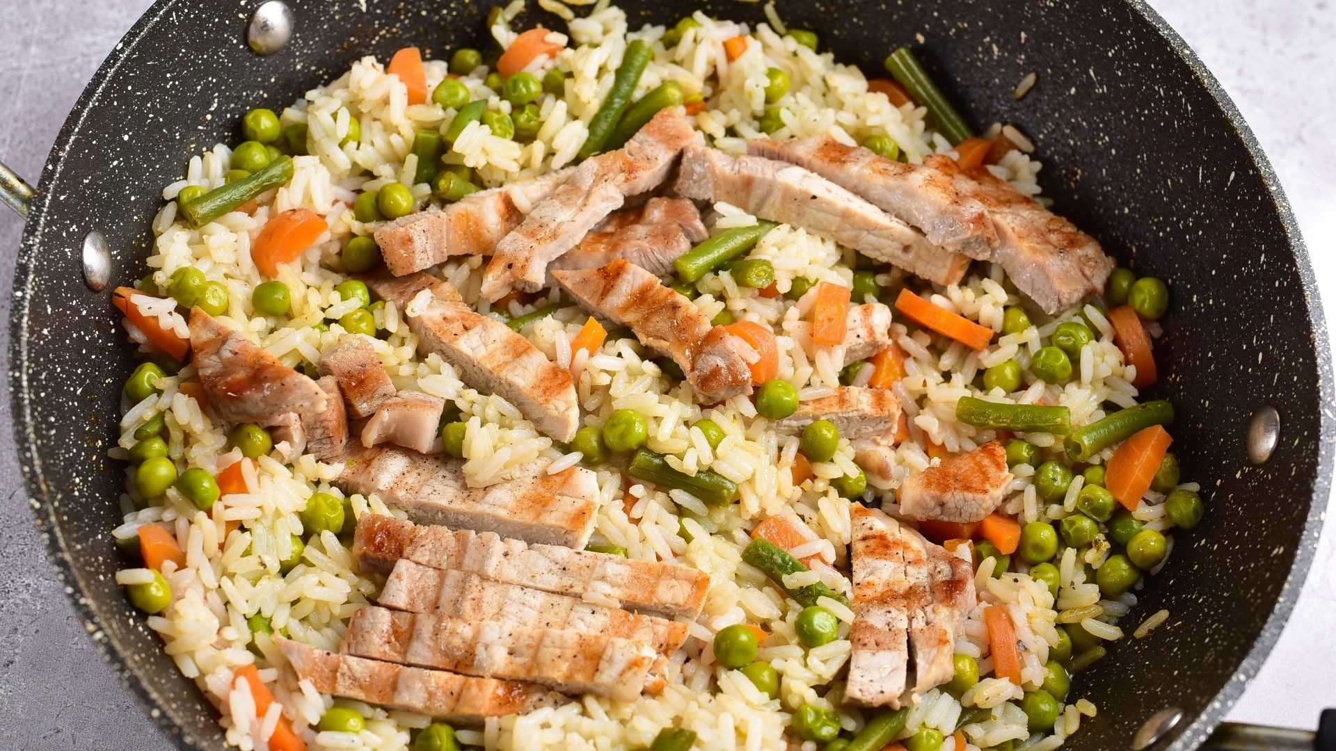 In addition to basic ingredients, the dish also contains many vegetables, which adds more fiber and vitamins. Pork Rice Stir Fry is perfect for lunch. You can use less fatty or more fatty pork.