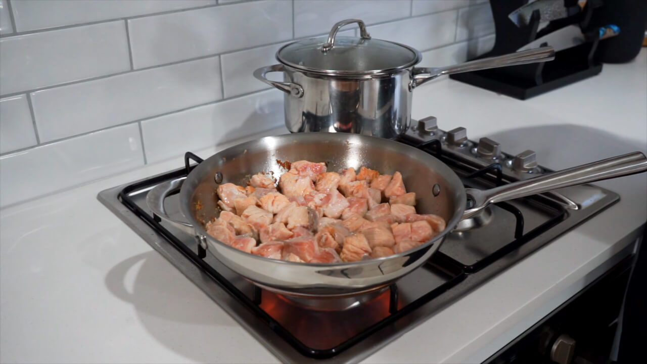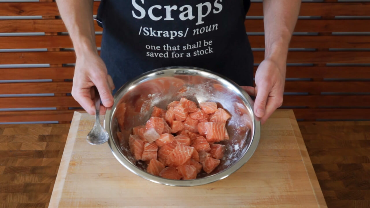 Place the salmon in a bowl and add 1 tablespoon of corn flour. Season it with sea salt flakes and mix until coated.