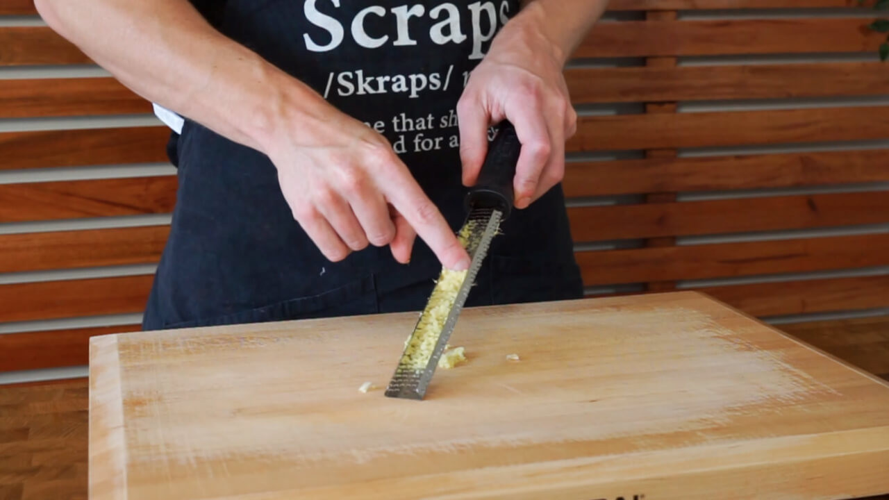 Grate 1 clove of garlic and 5 grams of peeled ginger using a microplane or fine box grater.