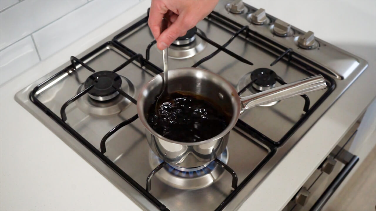In a small saucepan, add 60 milliliters of light soy sauce and 40 milliliters of dark soy sauce. Add 70 milliliters each of sake and mirin and 15 grams of sugar. Stir over high heat until the sugar melts, then bring to a boil. Reduce heat to low and let it simmer for 5 minutes.